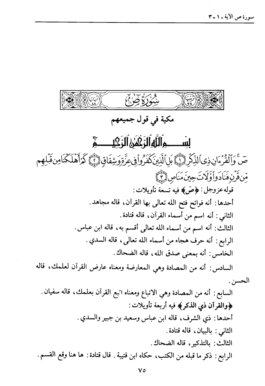 {ص والقرآن ذي الذكر بل الذين كفروا في عزة وشقاق كم أهلكنا من قبلهم من قرن فنادوا ولات حين مناص} قوله عز وجل: {ص} فيه تسعة تأويلات: أحدها: أنه فواتح الله تعالى بها القرآن , قاله مجاهد. الثاني: أنه اسم من أسماء القرآن , قاله قتادة. الثالث: أنه اسم من أسماء الله تعالى أقسم به , قاله ابن عباس. الرابع: أنه حرف هجاء من أسماء الله تعالى , قاله السدي. الخامس: أنه بمعنى صدق الله , قاله الضحاك. السادس: أنه من المصادة وهي المعارضة ومعناه عارض القرآن لعلمك , قاله الحسن. السابع: أنه من المصادة وهي الاتباع ومعناه اتبع القرآن بعلمك , قاله سفيان. {والقرآن ذي الذكر} فيه أربعة تأويلات: أحدها: ذي الشرف، قاله ابن عباس وسعيد بن جبير والسدي. الثاني: بالبيان، قاله قتادة. الثالث: بالتذكير، قاله الضحاك. الرابع: ذكر ما قبله من الكتب، حكاه ابن قتيبة. قال قتادة: ها هنا وقع القسم.