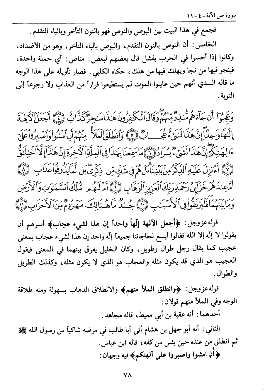 {وعجبوا أن جاءهم منذر منهم وقال الكافرون هذا ساحر كذاب أجعل الآلهة إلها واحدا إن هذا لشيء عجاب وانطلق الملأ منهم أن امشوا واصبروا على آلهتكم إن هذا لشيء يراد ما سمعنا بهذا في الملة الآخرة إن هذا إلا اختلاق أأنزل عليه الذكر من بيننا بل هم في شك من ذكري بل لما يذوقوا عذاب أم عندهم خزائن رحمة ربك العزيز الوهاب أم لهم ملك السماوات والأرض وما بينهما فليرتقوا في الأسباب جند ما هنالك مهزوم من الأحزاب} قوله عز وجل: {أجعل الآلهة إلهاً واحداً إن هذا لشيء عجاب} أمرهم أن يقولوا لا إله إلا الله أيسع لحاجَاتنا جميعاً إله واحد إن هذا لشيء عجاب بمعنى عجيب كما يقال رجل طوال وطويل، وكان الخليل يفرق بينهما في المعنى فيقول العجيب هو الذي قد يكون مثله والعجاب هو الذي لا يكون مثله , وكذلك الطويل والطوال. قوله عز وجل: {وانطلق الملأ منهم} والانطلاق الذهاب بسهولة ومنه طلاقة الوجه وفي الملأ منهم قولان: أحدهما: أنه عقبة بن معيط , قاله مجاهد. الثاني: أنه أبو جهل بن هشام أتى أبا طالب في مرضه شاكياً من رسول الله صلى الله عليه وسلم ثم انطلق من عنده حين يئس من كفه، قاله ابن عباس. {أَنِ امشوا واصبروا على آلهتكم} فيه وجهان: