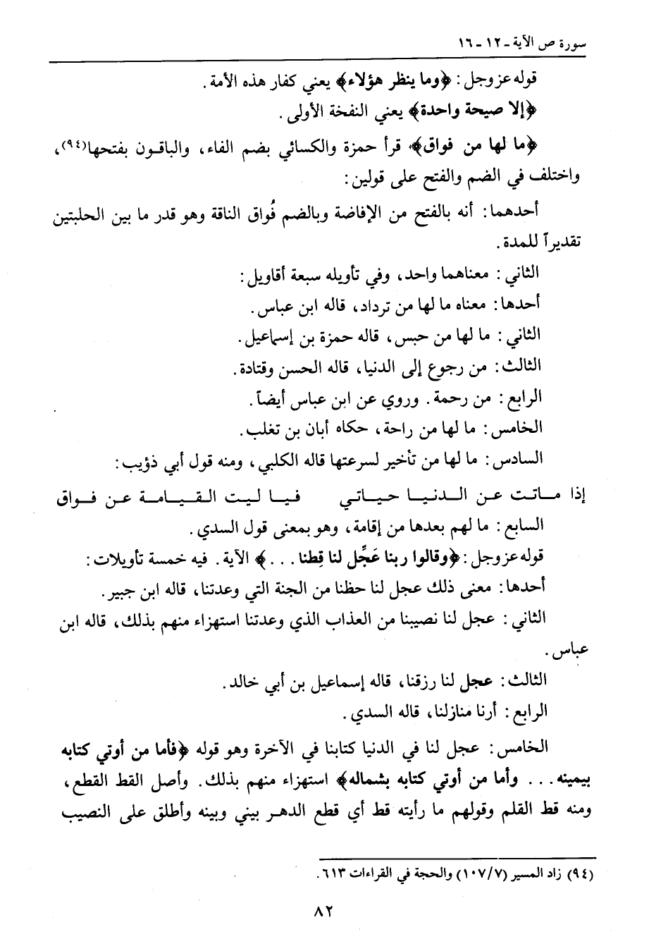 قوله عز وجل: {وما ينظر هؤلاء} يعني كفار هذه الأمة. {إلا صيحة واحدة} يعني النفخة الأولى. {ما لها من فواق} قرأ حمزة والكسائي بضم الفاء , والباقون بفتحها , واختلف في الضم والفتح على قولين: أحدهما: أنه بالفتح من الإفاضة وبالضم فُواق الناقة وهو قدر ما بين الحلبتين تقديراً للمدة. الثاني: معناهما واحد، وفي تأويله سبعة أقاويل: أحدها: معناه ما لها من ترداد، قاله ابن عباس. الثاني: ما لها من حبس، قاله حمزة بن إسماعيل. الثالث: من رجوع إلى الدنيا، قاله الحسن وقتادة. الرابع: من رحمة. وروي عن ابن عباس أيضاً. الخامس: ما لها من راحة، حكاه أبان بن تغلب. السادس: ما لها من تأخير لسرعتها قال الكلبي، ومنه قول أبي ذؤيب: