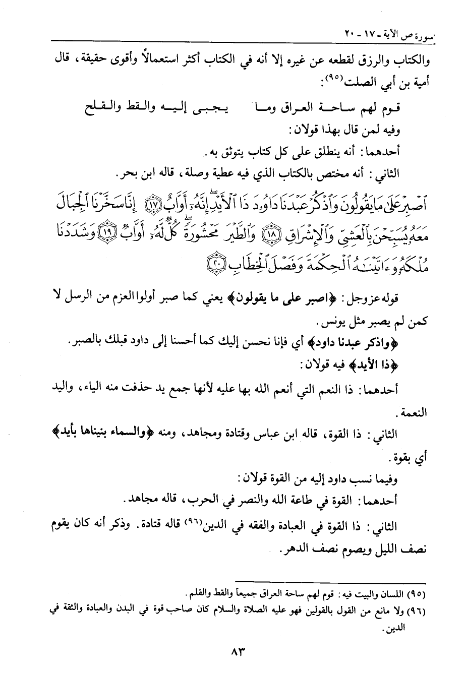 {اصبر على ما يقولون واذكر عبدنا داود ذا الأيد إنه أواب إنا سخرنا الجبال معه يسبحن بالعشي والإشراق والطير محشورة كل له أواب وشددنا ملكه وآتيناه الحكمة وفصل الخطاب} قوله عز وجل: {اصبر على ما يقولون} يعني كما صبر أولو العزم من الرسل لا كمن لم يصبر مثل يونس. {واذكر عبدنا داود} أي فإنا نحسن إليك كما أحسنا إلى داود قبلك بالصبر. {ذا الأيد} فيه قولان: أحدهما: ذا النعم التي أنعم الله بها عليه لأنها جمع يد حذفت منه الياء , واليد النعمة. الثاني: ذا القوة , قاله ابن عباس وقتادة ومجاهد , ومنه {والسماء بنيناها بأيد} أي بقوة. وفيما نسب داود إليه من القوة قولان: أحدهما: القوة في طاعة الله والنصر في الحرب , قاله مجاهد. الثاني: ذا القوة في العبادة والفقه في الدين قاله قتادة. وذكر أنه كان يقوم نصف الليل ويصوم نصف الدهر.