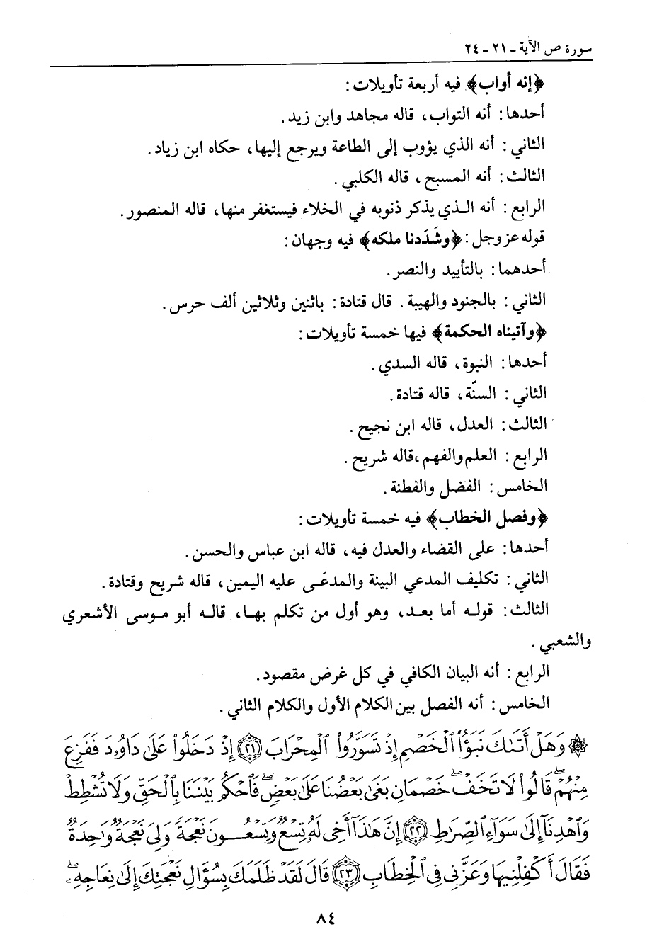 {إنه أواب} فيه أربعة تأويلات: أحدها: أنه التواب , قاله مجاهد وابن زيد. الثاني: أنه الذي يؤوب إلى الطاعة ويرجع إليها , حكاه ابن زيد. الثالث: أنه المسبح , قاله الكلبي. الرابع: أنه الذي يذكر ذنوبه في الخلاء فيستغفر منها , قاله المنصور. قوله عز وجل: {وشَدَدنا ملكه} فيه وجهان: أحدهما: بالتأييد والنصر. الثاني: بالجنود والهيبة. قال قتادة: باثنين وثلاثين ألف حرس. {وآتيناه الحكمة} فيها خمسة تأويلات: أحدها: النبوة , قاله السدي. الثاني: السنّة , قاله قتادة. الثالث: العدل , قاله ابن نجيح. الرابع: العلم والفهم , قاله شريح. الخامس: الفضل والفطنة. {وفصل الخطاب} فيه خمسة تأويلات: أحدها: على القضاء والعدل فيه , قاله ابن عباس والحسن. الثاني: تكليف المدعي البينة والمدعَى عليه اليمين , قاله شريح وقتادة. الثالث: قوله أما بعد , وهو أول من تكلم بها , قاله أبو موسى الأشعري والشعبي. الرابع: أنه البيان الكافي في كل غرض مقصود. الخامس: أنه الفصل بين الكلام الأول والكلام الثاني.