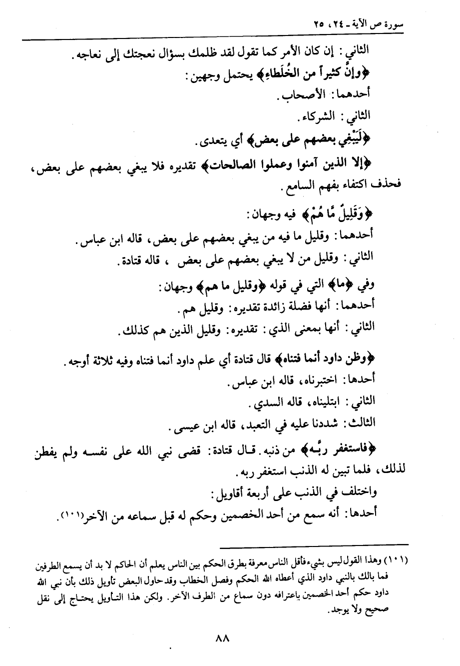 الثاني: إن كان الأمر كما تقول لقد ظلمك بسؤال نعجتك إلى نعاجه. {وإنَّ كثيراً من الخُلَطاءِ} يحتمل وجهين: أحدهما: الأصحاب. الثاني: الشركاء. {لَيَبْغِي بعضهم على بعض} أي يتعدى. {إلا الذين آمنوا وعملوا الصالحات} تقديره فلا يبغي بعضهم على بعض , فحذف اكتفاء بفهم السامع. {وَقَلِيلٌ مَّا هُمْ} فيه وجهان: أحدهما: وقليل ما فيه من يبغي بعضهم على بعض , قاله ابن عباس. الثاني: وقليل من لا يبغي بعضهم على بعض , قاله قتادة. وفي {ما} التي في قوله {وقليل ما هم} وجهان: أحدهما: انها فضلة زائدة تقديره: وقليل هم. الثاني: أنها بمعنى الذي: تقديره: وقليل الذي هم كذلك. {وظن داود أنما فتناه} قال قتادة أي علم داود أنما فتناه وفيه ثلاثة أوجه: أحدها: اختبرناه، قاله ابن عباس. الثاني: ابتليناه، قاله السدي. الثالث: شددنا عليه في التعبد، قاله ابن عيسى. {فاستغفر ربَّه} من ذنبه. قال قتادة: قضى نبي الله على نفسه ولم يفطن لذلك , فلما تبين له الذنب استغفر ربه. واختلف في الذنب على أربعة أقاويل: أحدها: أنه سمع من أحد الخصمين وحكم له قبل سماعه من الآخر.