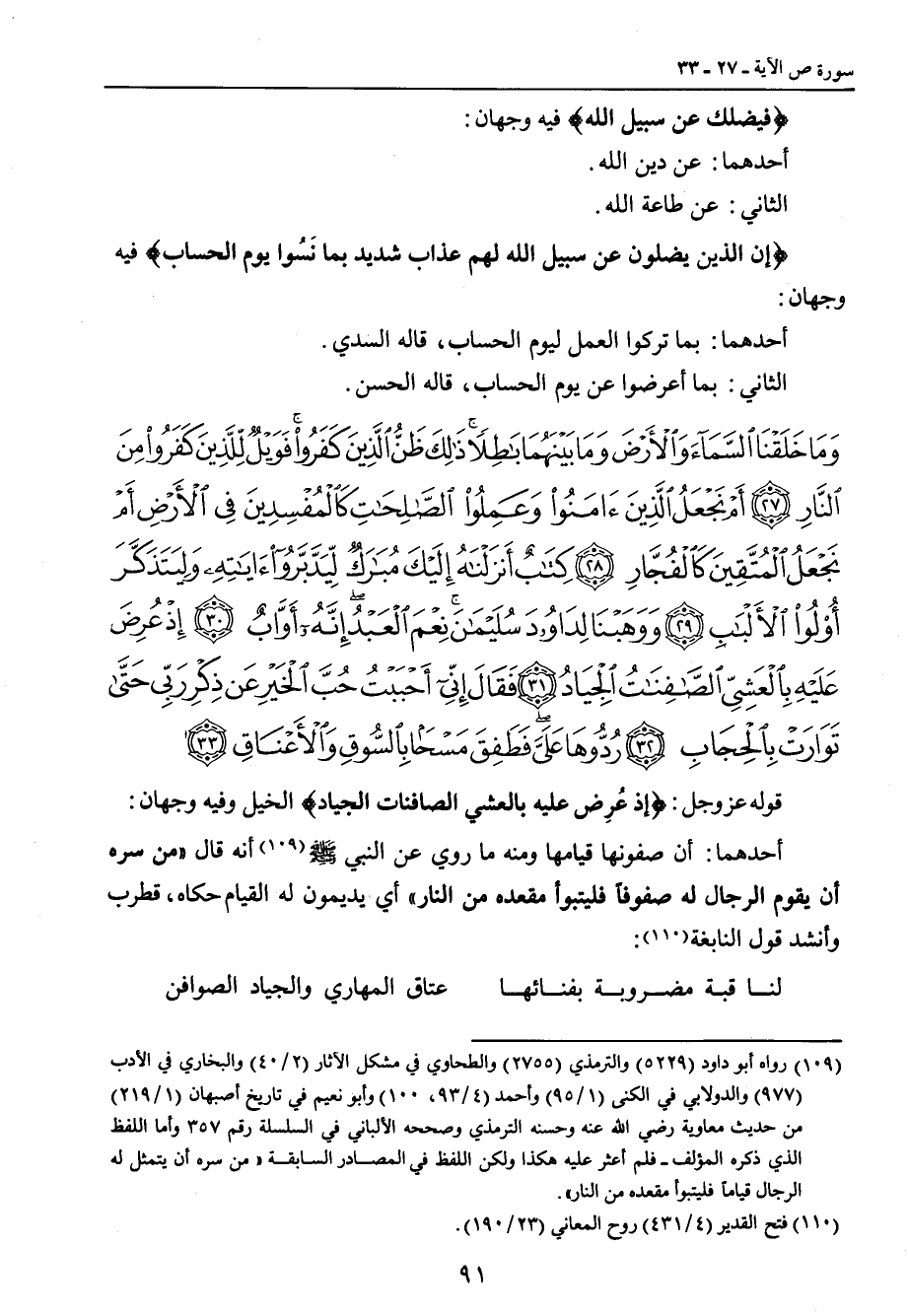 {وما خلقنا السماء والأرض وما بينهما باطلا ذلك ظن الذين كفروا فويل للذين كفروا من النار أم نجعل الذين آمنوا وعملوا الصالحات كالمفسدين في الأرض أم نجعل المتقين كالفجار كتاب أنزلناه إليك مبارك ليدبروا آياته وليتذكر أولوا الألباب ووهبنا لداود سليمان نعم العبد إنه أواب إذ عرض عليه بالعشي الصافنات الجياد فقال إني أحببت حب الخير عن ذكر ربي حتى توارت بالحجاب ردوها علي فطفق مسحا بالسوق والأعناق} قوله عز وجل: {إذ عُرِض عليه بالعشي الصافنات الجياد} الخيل وفيه وجهان: أحدهما: أن صفونها قيامها ومنه ما روي عن النبي صلى الله عليه وسلم أنه قال: (من سره أن يقوم الرجال له صفوفاً فليتبوأ مقعده من النار) أي يديمون له القيام حكاه قطرب وأنشد قول النابغة: