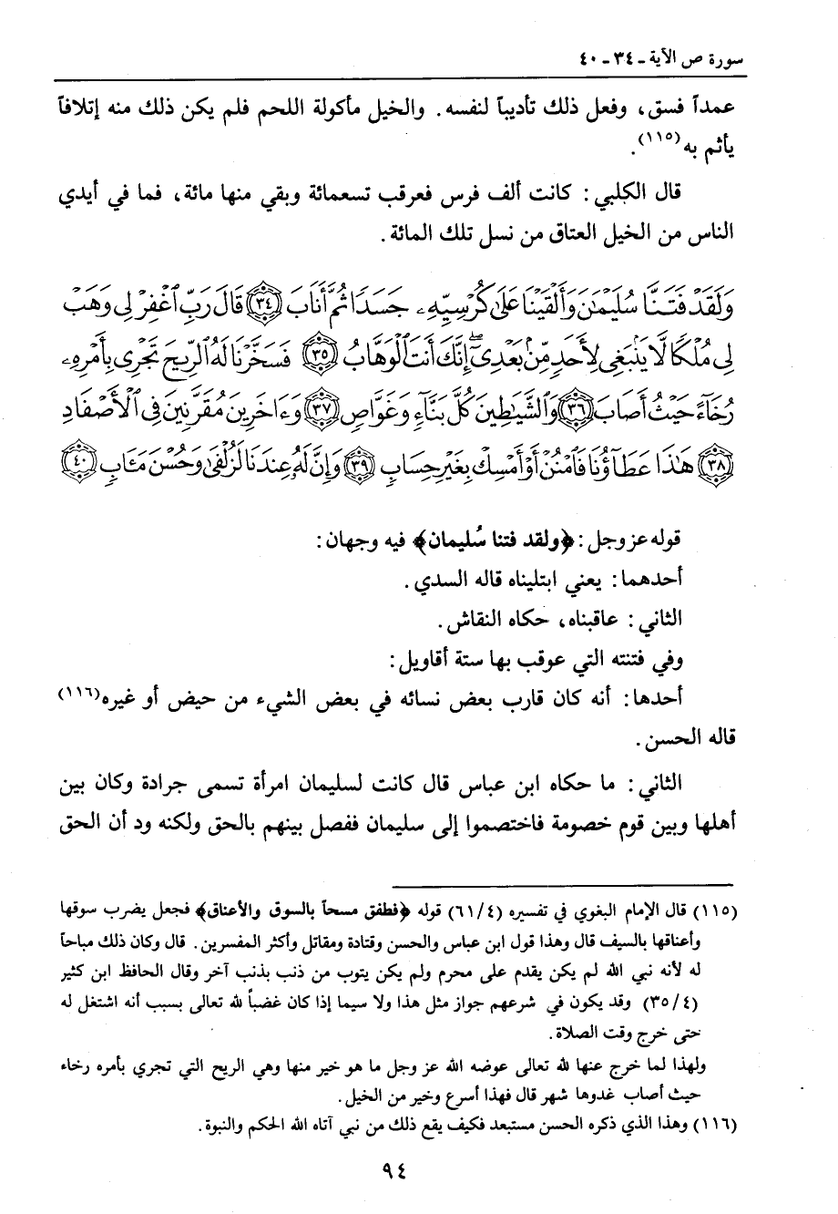 {ولقد فتنا سليمان وألقينا على كرسيه جسدا ثم أناب قال رب اغفر لي وهب لي ملكا لا ينبغي لأحد من بعدي إنك أنت الوهاب فسخرنا له الريح تجري بأمره رخاء حيث أصاب والشياطين كل بناء وغواص وآخرين مقرنين في الأصفاد هذا عطاؤنا فامنن أو أمسك بغير حساب وإن له عندنا لزلفى وحسن مآب} قوله عز وجل: {ولقد فتنا سُليمان} فيه وجهان: أحدهما: يعني ابتليناه قاله السدي. الثاني: عاقبناه، حكاه النقاش. وفي فتنته التي عوقب بها ستة أقاويل: أحدهما: أنه كان قارب بعض نسائه في بعض الشيء من حيض أو غيره قاله الحسن. الثاني: ما حكاه ابن عباس قال كانت لسليمان امرأة تسمى جرادة وكان بين أهلها وبين قوم خصومة فاختصموا إلى سليمان ففصل بينهم بالحق ولكنه ود أن الحق