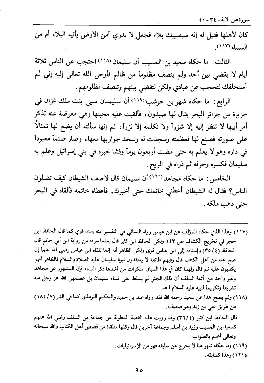 كان لأهلها فقيل له إنه سيصيبك بلاء فجعل لا يدري أمن الأرض يأتيه البلاء أم من السماء. الثالث: ما حكاه سعيد بن المسيب أن سليمان احتجب عن الناس ثلاثة أيام لا يقضي بين أحد ولم ينصف مظلوماً من ظالم فأوحى الله تعالى إليه إني لم أستخلفك لتحجب عن عبادي ولكن لتقضي بينهم وتنصف مظلومهم. الرابع: ما حكاه شهر بن حوشب أن سليمان سبى بنت ملك غزان في جزيرة من جزائر البحر يقال لها صيدون , فألقيت عليه محبتها وهي معرضة عنه تذكر أمر أبيها لا تنظر إليه إلا شزراً ولا تكلمه إلا نزراً، ثم إنها سألته أن يضع لها تمثالاً على صورته فصنع لها فعظمته وسجدت له وسجد جواريها معها , وصار صنماً معبوداً في داره وهو لا يعلم به حتى مضت أربعون يوماً وفشا خبره في بني إسرائيل وعلم به سليمان فكسره وحرقه ثم ذراه في الريح. الخامس: ما حكاه مجاهد أن سليمان قال لآصف الشيطان كيف تضلون الناس؟ فقال له الشيطان أعطني خاتمك حتى أخبرك , فأعطاه خاتمه فألقاه في البحر حتى ذهب ملكه.