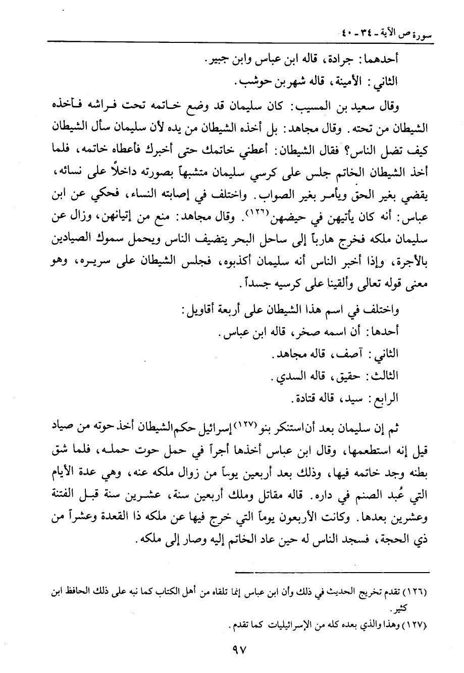 أحدهما: جرادة , قاله ابن عباس وابن جبير. الثاني: الأمينة , قاله شهر بن حوشب. وقال سعيد بن المسيب: كان سليمان قد وضع خاتمه تحت فراشه فأخذه الشيطان من تحته. وقال مجاهد: بل أخذه الشيطان من يده لأن سليمان سأل الشيطان كيف تضل الناس؟ فقال الشيطان: أعطني خاتمك حتى أخبرك فأعطاه خاتمه , فلما أخذ الشيطان الخاتم جلس على كرسي سليمان متشبهاً بصورته داخلاً على نسائه , يقضي بغير الحق ويأمر بغير صواب. واختلف في إصابته النساء , فحكي عن ابن عباس: أنه كان يأتيهن في حيضهن. وقال مجاهد: منع من إتيانهن , وزال عن سليمان ملكه فخرج هارباً إلى ساحل البحر يتضيف الناس ويحمل سموك الصيادين بالأجرة , وإذا أخبر الناس أنه سليمان أكذبوه , فجلس الشيطان على سريره , وهو معنى قوله تعالى وألقينا على كرسيه جسداً. واختلف في اسم هذا الشيطان على أربعة أقاويل: أحدها: أن اسمه صخر , قاله ابن عباس. الثاني: آصف , قاله مجاهد. الثالث: حقيق , قاله السدي. الرابع: سيد , قاله قتادة. ثم إن سليمان بعد أن استنكر بنو إسرائيل حكم الشيطان أخذ حوته من صياد قيل إنه استطعمها , وقال ابن عباس أخذها أجراً في حمل حوت حمله , فلما شق بطنه وجد خاتمه فيها , وذكل بعد أربعين يوماً من زوال ملكه عنه , وهي عدة الأيام التي عُبد الصنم في داره. قاله مقاتل وملك أربعين سنة، عشرين سنة قبل الفتنة وعشرين بعدها. وكانت الأربعون يوماً التي خرج فيها عن ملكه ذا القعدة وعشراً من ذي الحجة، فسجد الناس له حين عاد الخاتم إليه وصار إلى ملكه.