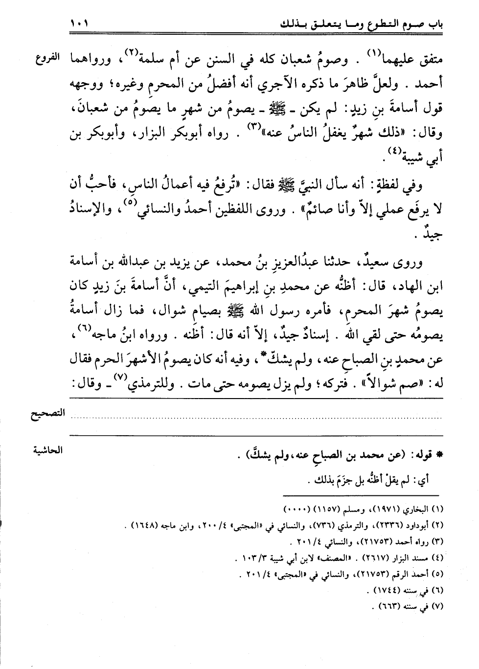 مُتَّفَقٌ عَلَيْهِمَا1, وَصَوْمُ شَعْبَانَ كُلِّهِ فِي السُّنَنِ عَنْ أُمِّ سَلَمَةَ2, وَرَوَاهُمَا أَحْمَدُ, وَلَعَلَّ ظَاهِرَ مَا ذَكَرَهُ الْآجُرِّيُّ أَنَّهُ أَفْضَلُ مِنْ الْمُحَرَّمِ وَغَيْرِهِ, وَوَجْهُهُ قَوْلُ أُسَامَةَ بْنِ زَيْدٍ: لَمْ يَكُنْ عَلَيْهِ السَّلَامُ يَصُومُ مِنْ شَهْرٍ مَا يَصُومُ مِنْ شَعْبَانَ, وَقَالَ: ذَلِكَ شَهْرُ يَغْفُلُ النَّاسُ عَنْهُ3. رَوَاهُ أَبُو بَكْرٍ الْبَزَّارُ وَأَبُو بَكْرِ بْنُ أَبِي شَيْبَةَ4.
