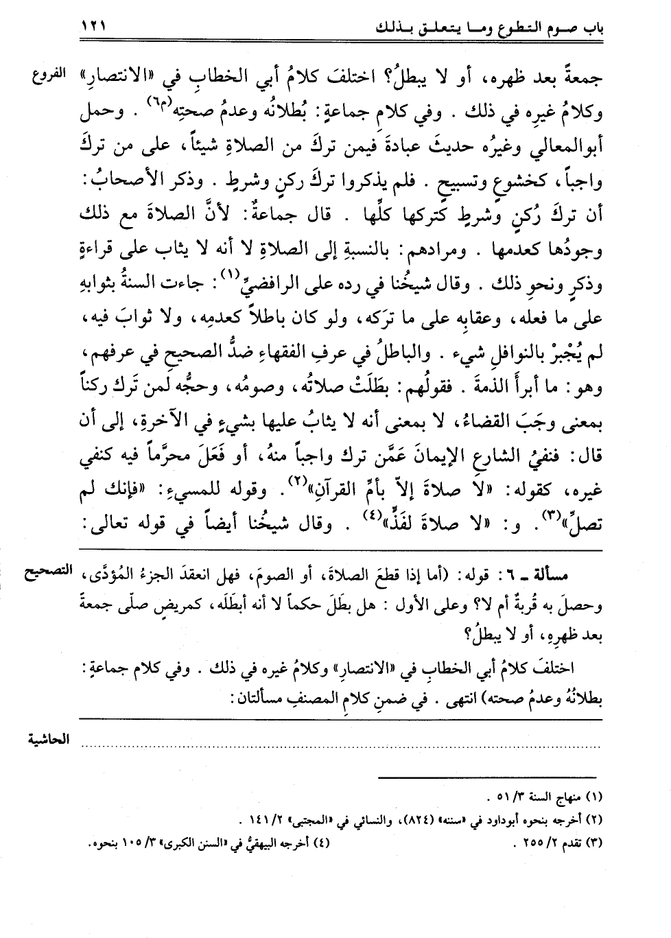 جُمُعَةً بَعْدَ ظُهْرِهِ, أَوْ لَا يَبْطُلُ؟ اخْتَلَفَ كَلَامُ أَبِي الْخَطَّابِ فِي الِانْتِصَارِ وَكَلَامُ غَيْرِهِ فِي ذَلِكَ. وَفِي كَلَامِ جَمَاعَةٍ بُطْلَانُهُ وَعَدَمُ صِحَّتِهِ "م 5" وَحَمَلَ أَبُو الْمَعَالِي وَغَيْرُهُ حَدِيثَ عُبَادَةَ فِيمَنْ تَرَكَ مِنْ الصَّلَاةِ شَيْئًا عَلَى مَنْ تَرَكَ وَاجِبًا كَخُشُوعٍ وَتَسْبِيحٍ, فَلَمْ يَذْكُرُوا تَرْكَ رُكْنٍ وَشَرْطٍ, وَذَكَرَ الْأَصْحَابُ أَنَّ تَرْكَ رُكْنٍ وَشَرْطٍ كَتَرْكِهَا كُلِّهَا, قَالَ جَمَاعَةٌ: لِأَنَّ الصَّلَاةَ مَعَ ذَلِكَ وُجُودُهَا كَعَدَمِهَا, وَمُرَادُهُمْ بِالنِّسْبَةِ إلَى الصَّلَاةِ لَا أَنَّهُ لَا يُثَابُ عَلَى قِرَاءَةٍ وَذِكْرٍ وَنَحْوِ ذَلِكَ. وَقَالَ شَيْخُنَا فِي رَدِّهِ عَلَى الرَّافِضِيِّ1: جَاءَتْ السُّنَّةُ بِثَوَابِهِ عَلَى مَا فَعَلَهُ وَعِقَابِهِ عَلَى مَا تَرَكَهُ, وَلَوْ كَانَ بَاطِلًا كَعَدَمِهِ وَلَا ثَوَابَ فِيهِ لَمْ يُجْبَرْ بِالنَّوَافِلِ شَيْءٌ. وَالْبَاطِلُ فِي عُرْفِ الْفُقَهَاءِ ضِدُّ الصَّحِيحِ فِي عُرْفِهِمْ, وَهُوَ مَا أَبْرَأَ الذِّمَّةَ, فَقَوْلُهُمْ بَطَلَتْ صَلَاتُهُ وَصَوْمُهُ وَحَجُّهُ لِمَنْ تَرَكَ رُكْنًا بِمَعْنَى وَجَبَ الْقَضَاءُ, لَا بِمَعْنَى أَنَّهُ لَا يُثَابُ عَلَيْهَا بِشَيْءٍ فِي الْآخِرَةِ, إلَى أَنْ قَالَ: فَنَفَى الشَّارِعُ الْإِيمَانَ عَمَّنْ تَرَكَ وَاجِبًا مِنْهُ أَوْ فَعَلَ مُحَرَّمًا فِيهِ كَنَفْيِ غَيْرِهِ, كَقَوْلِهِ: "لَا صَلَاةَ إلَّا بِأُمِّ الْقُرْآنِ" 2 وَقَوْلِهِ لِلْمُسِيءِ: "فَإِنَّك لَمْ تُصَلِّ" 3 وَ "لَا صَلَاةَ لِفَذٍّ" 4 وَقَالَ شَيْخُنَا أَيْضًا فِي قوله تعالى: