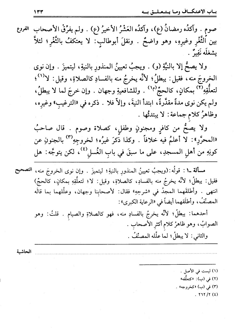 وَلَا يَصِحُّ إلَّا بِالنِّيَّةِ "وَ" وَيَجِبُ تَعْيِينُ الْمَنْذُورِ بِالنِّيَّةِ لِيَتَمَيَّزَ, وَإِنْ نَوَى الْخُرُوجَ مِنْهُ فَقِيلَ: يَبْطُلُ, لِأَنَّهُ يَخْرُجُ مِنْهُ بِالْفَسَادِ, كَالصَّلَاةِ, وَقِيلَ: لَا1, لِتَعَلُّقِهِ2 بِمَكَانٍ, كَالْحَجِّ "م 1" وَلِلشَّافِعِيَّةِ وَجْهَانِ, وَإِنْ خَرَجَ لِمَا لَا يُبْطِلُ وَلَمْ يَكُنْ نَوَى مُدَّةً مُقَدَّرَةً ابْتِدَاءَ النِّيَّةِ, وَإِلَّا فَلَا, ذَكَرَهُ فِي التَّرْغِيبِ وَغَيْرِهِ, وَظَاهِرُ كَلَامِ جَمَاعَةٍ: لَا يَبْتَدِئُهَا.