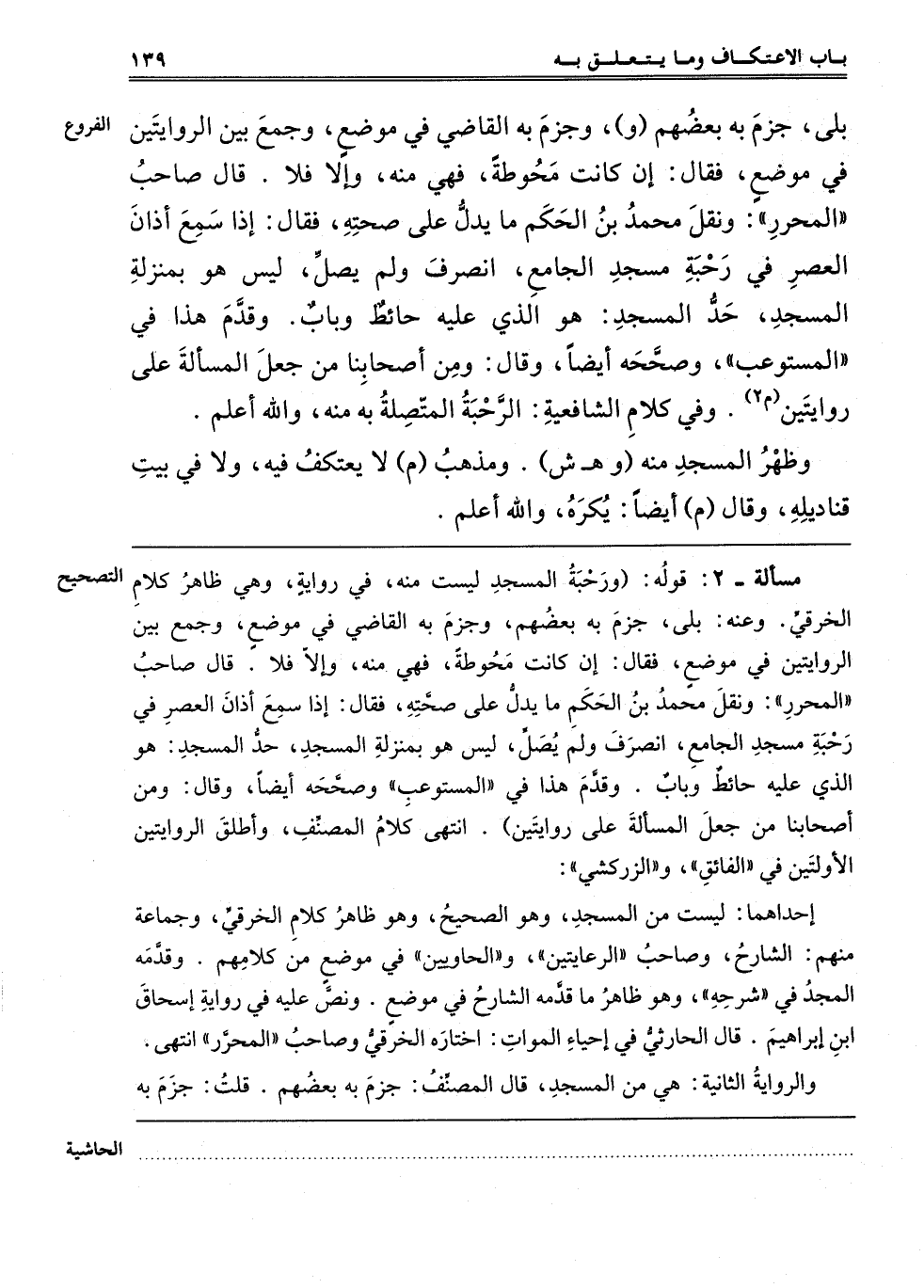 ـــــــــــــــــــــــــــــQمَسْأَلَةٌ 2 قَوْلُهُ: وَرَحَبَةُ الْمَسْجِدِ لَيْسَتْ مِنْهُ, فِي رِوَايَةٍ, وَهِيَ ظَاهِرُ كَلَامِ الْخِرَقِيِّ وَعَنْهُ: بَلَى, جَزَمَ بِهِ بَعْضُهُمْ, وَجَزَمَ بِهِ الْقَاضِي فِي مَوْضِعٍ, وَجَمَعَ بَيْنَ الرِّوَايَتَيْنِ فِي مَوْضِعٍ, فَقَالَ: إنْ كَانَتْ مَحُوطَةً فَهِيَ مِنْهُ, وَإِلَّا فَلَا, قَالَ صَاحِبُ الْمُحَرَّرِ: وَنَقَلَ مُحَمَّدُ بْنُ الْحَكَمِ مَا يَدُلُّ عَلَى صِحَّتِهِ فَقَالَ: إذَا سَمِعَ أَذَانَ الْعَصْرِ فِي رَحَبَةِ مَسْجِدِ الْجَامِعِ انْصَرَفَ وَلَمْ يُصَلِّ, لَيْسَ هُوَ بِمَنْزِلَةِ الْمَسْجِدِ, حَدُّ الْمَسْجِدِ هُوَ الَّذِي عَلَيْهِ حَائِطٌ وَبَابٌ, وَقَدَّمَ هَذَا فِي الْمُسْتَوْعِبِ وَصَحَّحَهُ أَيْضًا وَقَالَ: وَمِنْ أصحابنا من جعل الْمَسْأَلَةَ عَلَى رِوَايَتَيْنِ انْتَهَى كَلَامُ الْمُصَنِّفِ وَأَطْلَقَ الرِّوَايَتَيْنِ الْأُولَتَيْنِ فِي الْفَائِقِ وَالزَّرْكَشِيِّ.