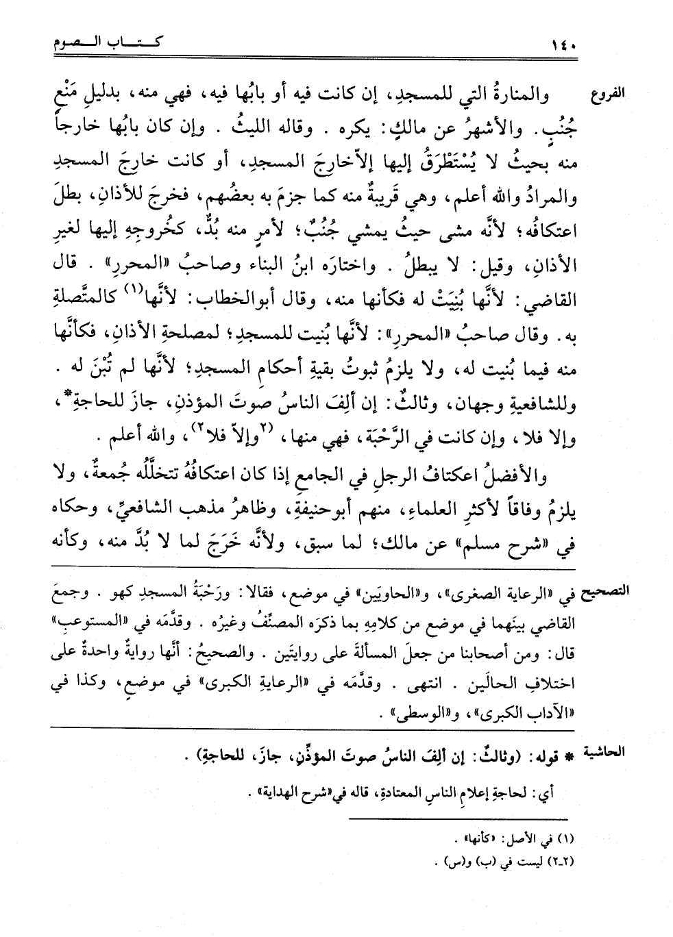 وَالْمَنَارَةُ الَّتِي لِلْمَسْجِدِ إنْ كَانَتْ فِيهِ أَوْ بَابُهَا فِيهِ فَهِيَ مِنْهُ, بِدَلِيلِ مَنْعِ جُنُبٍ وَالْأَشْهَرُ عَنْ مَالِكٍ: يُكْرَهُ, وَقَالَهُ اللَّيْثُ. وَإِنْ كَانَ بَابُهَا خَارِجًا مِنْهُ بِحَيْثُ لَا يَسْتَطْرِقُ إلَيْهَا إلَّا خَارِجَ الْمَسْجِدِ أَوْ كَانَتْ خَارِجَ الْمَسْجِدِ وَالْمُرَادُ وَاَللَّهُ أَعْلَمُ وَهِيَ قَرِيبَةٌ مِنْهُ كَمَا جَزَمَ "بِهِ" بَعْضُهُمْ فَخَرَجَ لِلْأَذَانِ بَطَلَ اعْتِكَافُهُ, لِأَنَّهُ مَشَى حَيْثُ يَمْشِي جُنُبٌ, لِأَمْرٍ مِنْهُ بُدٌّ, كَخُرُوجِهِ إلَيْهَا لِغَيْرِ الْأَذَانِ, وَقِيلَ: لَا يَبْطُلُ, وَاخْتَارَهُ ابْنُ الْبَنَّا وَصَاحِبُ الْمُحَرَّرِ. وَقَالَ الْقَاضِي: لِأَنَّهَا بُيِّتَتْ لَهُ, فَكَأَنَّهَا مِنْهُ. وقال أبو الخطاب: لأنها1 كالمتصلة بِهِ. وَقَالَ صَاحِبُ الْمُحَرَّرِ: لِأَنَّهَا بُنِيَتْ لِلْمَسْجِدِ لِمَصْلَحَةِ الْأَذَانِ, فَكَأَنَّهَا مِنْهُ فِيمَا بُنِيَتْ لَهُ, وَلَا يَلْزَمُ مِنْهُ "ثُبُوتُ" بَقِيَّةِ أَحْكَامِ الْمَسْجِدِ, لِأَنَّهَا لَمْ تُبْنَ لَهُ, وَلِلشَّافِعِيَّةِ وَجْهَانِ, وَثَالِثٌ: إنْ أَلِفَ النَّاسُ صَوْتَ الْمُؤَذِّنِ جَازَ, لِلْحَاجَةِ وَإِلَّا فَلَا, وَإِنْ كَانَتْ فِي الرَّحَبَةِ فَهِيَ مِنْهَا 2"وَإِلَّا فَلَا"2 وَاَللَّهُ أَعْلَمُ.