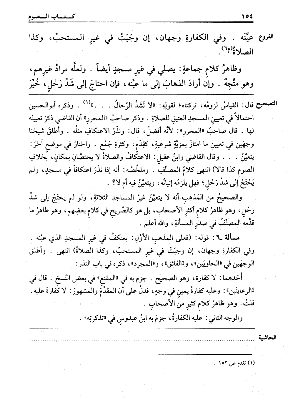 "مَسْأَلَةٌ 6" قَوْلٌ: فَعَلَى الْمَذْهَبِ الْأَوَّلِ يَعْتَكِفُ فِي غَيْرِ الْمَسْجِدِ الَّذِي عَيَّنَهُ, وَفِي الْكَفَّارَةِ وَجْهَانِ إنْ وَجَبَتْ فِي غَيْرِ الْمُسْتَحَبِّ, وَكَذَا الصَّلَاةُ, انْتَهَى, وَأَطْلَقَ الْوَجْهَيْنِ فِي الْحَاوِيَيْنِ وَالْفَائِق وَالْمُجَرَّدِ, ذَكَرَهُ فِي بَابِ النَّذْرِ.