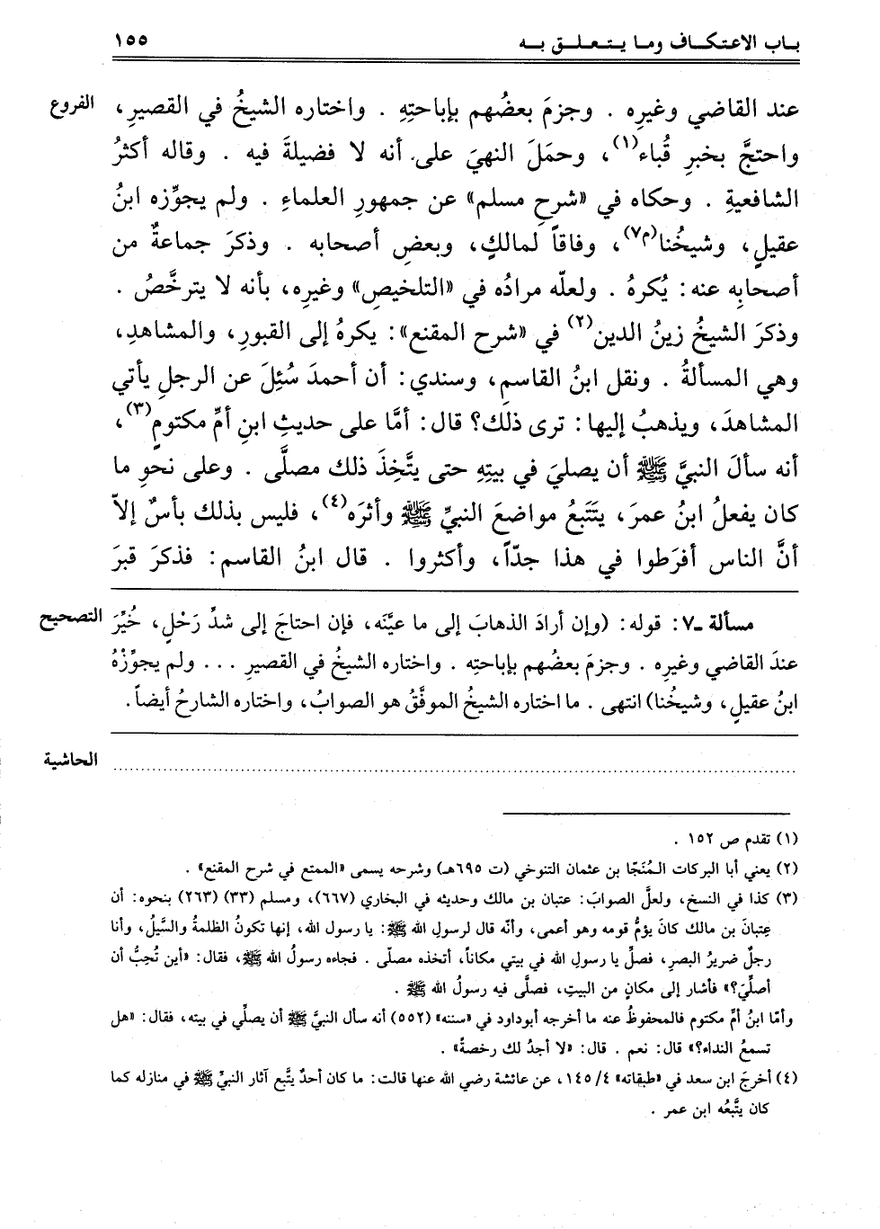 عِنْدَ الْقَاضِي وَغَيْرِهِ, وَجَزَمَ بَعْضُهُمْ بِإِبَاحَتِهِ, وَاخْتَارَهُ الشَّيْخُ فِي الْقَصِيرِ, وَاحْتَجَّ بِخَبَرِ قُبَاءَ1, وَحَمَلَ النَّهْيَ عَلَى أَنَّهُ لَا فَضِيلَةَ فِيهِ, وَقَالَهُ أَكْثَرُ الشَّافِعِيَّةِ, وَحَكَاهُ فِي شَرْحِ مُسْلِمٍ عَنْ جُمْهُورِ الْعُلَمَاءِ, وَلَمْ يُجَوِّزْهُ ابْنُ عَقِيلٍ وَشَيْخُنَا "م 7" "وم" وَبَعْضُ أَصْحَابِهِ, وَذَكَرَ جَمَاعَةٌ مِنْ أَصْحَابِهِ عَنْهُ: يُكْرَهُ, وَلَعَلَّهُ مُرَادُهُ فِي التَّخْلِيصِ وَغَيْرِهِ بِأَنَّهُ لَا يَتَرَخَّصُ, وَذَكَرَ الشَّيْخُ زَيْنُ الدِّينِ2 فِي شرح المقنع: يكره إلى الْقُبُورِ وَالْمَشَاهِدِ وَهِيَ الْمَسْأَلَةُ, وَنَقَلَ ابْنُ الْقَاسِمِ وَشِنْدِيّ أَنَّ أَحْمَدَ سُئِلَ عَنْ الرَّجُلِ يَأْتِي الْمَشَاهِدَ وَيَذْهَبُ إلَيْهَا: تَرَى ذَلِكَ؟ قَالَ: أَمَّا عَلَى حَدِيثِ ابْنِ أُمِّ مَكْتُومٍ3 أَنَّهُ سَأَلَ النَّبِيِّ صَلَّى اللَّهُ عَلَيْهِ وَسَلَّمَ أَنْ يُصَلِّيَ فِي بَيْتِهِ حَتَّى يَتَّخِذَ ذَلِكَ مُصَلًّى, وَعَلَى نَحْوِ مَا كَانَ يَفْعَلُ ابْنُ عُمَرَ يَتْبَعُ مَوَاضِعَ النَّبِيِّ صَلَّى اللَّهُ عَلَيْهِ وَسَلَّمَ وَأَثَرَهُ4, فَلَيْسَ بِذَلِكَ بَأْسٌ, إلَّا أَنَّ النَّاسَ أَفْرَطُوا فِي هَذَا جِدًّا وَأَكْثَرُوا, قَالَ ابْنُ الْقَاسِمِ, فذكر قبر