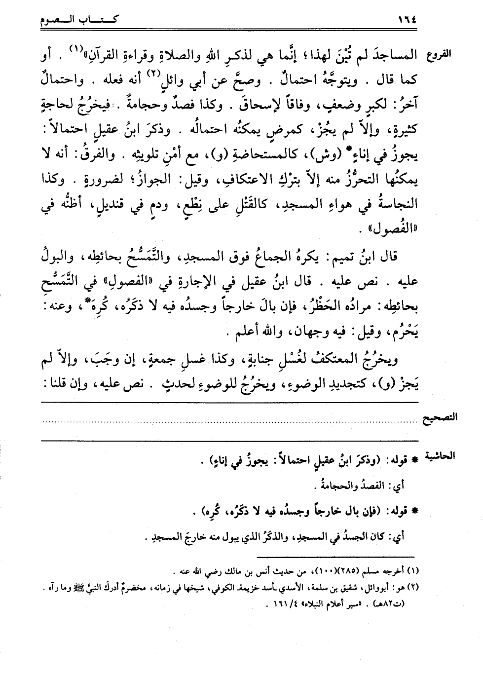 الْمَسَاجِدَ لَمْ تُبْنَ لِهَذَا إنَّمَا هِيَ لِذِكْرِ اللَّهِ وَالصَّلَاةِ وَقِرَاءَةِ الْقُرْآنِ" 1 أَوْ كَمَا قَالَ وَيَتَوَجَّهُ احْتِمَالٌ, وَصَحَّ عَنْ أَبِي وَائِلٍ2 أَنَّهُ فَعَلَهُ, وَاحْتِمَالٌ آخَرُ: لِكِبَرٍ وَضَعْفٍ وِفَاقًا لِإِسْحَاقَ, وَكَذَا فَصْدٌ وَحِجَامَةٌ, فَيَخْرُجُ لِحَاجَةٍ كَثِيرَةٍ, وَإِلَّا لَمْ يَجُزْ, كَمَرَضٍ يُمْكِنُهُ احْتِمَالُهُ, وَذَكَرَ ابْنُ عَقِيلٍ احْتِمَالًا: يَجُوزُ فِي إنَاءٍ "وش" كَالْمُسْتَحَاضَةِ "و" مَعَ أَمْنِ تَلْوِيثِهِ, وَالْفَرْقُ أَنَّهُ لَا يُمْكِنُهَا التَّحَرُّزُ مِنْهُ إلَّا بِتَرْكِ الِاعْتِكَافِ, وَقِيلَ: الْجَوَازُ لِضَرُورَةٍ, وَكَذَا النَّجَاسَةُ فِي هَوَاءِ الْمَسْجِدِ, كَالْقَتْلِ عَلَى نِطْعٍ, وَدَمٍ فِي قِنْدِيلٍ, أَظُنُّهُ فِي الْفُصُولِ.