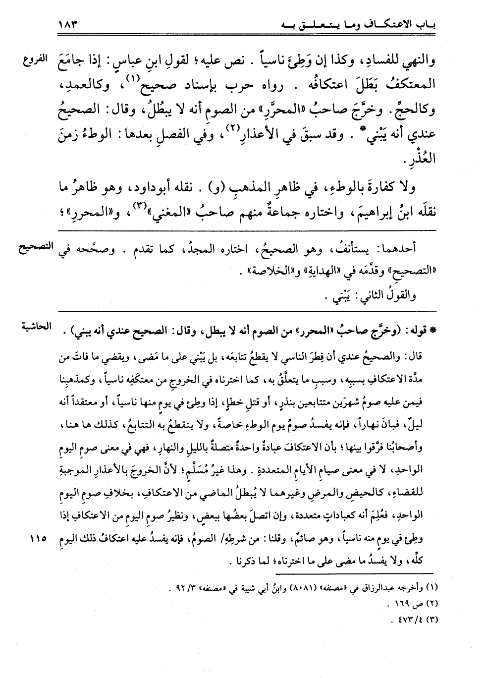 وَالنَّهْيُ لِلْفَسَادِ, وَكَذَا إنْ وَطِئَ نَاسِيًا, نَصَّ عَلَيْهِ, لِقَوْلِ ابْنِ عَبَّاسٍ: إذَا جَامَعَ الْمُعْتَكِفُ بَطَلَ اعْتِكَافُهُ, رَوَاهُ حَرْبٌ بِإِسْنَادٍ صَحِيحٍ1, وَكَالْعَمْدِ وَكَالْحَجِّ, وَخَرَّجَ صَاحِبُ الْمُحَرَّرِ مِنْ الصَّوْمِ أَنَّهُ لَا يُبْطِلُ. وَقَالَ: الصَّحِيحُ عِنْدِي "أَنَّهُ" يَبْنِي, وَقَدْ سَبَقَ فِي الْإِعْذَارِ2, وَفِي الْفَصْلِ بَعْدهَا الْوَطْءُ زَمَنَ الْعُذْرِ.