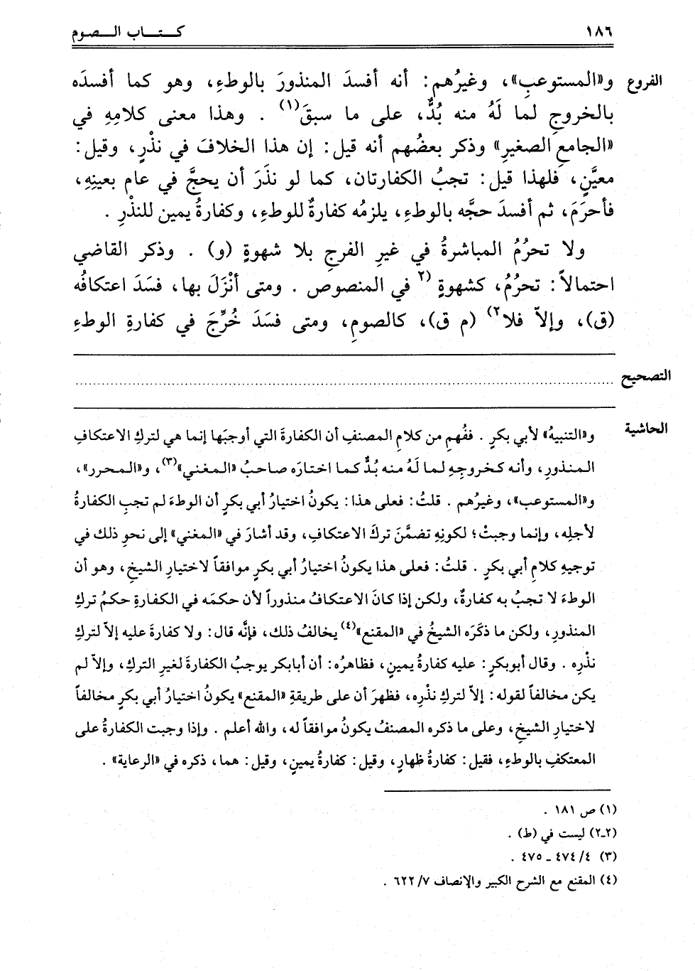 وَالْمُسْتَوْعِبِ وَغَيْرِهِمْ أَنَّهُ أَفْسَدَ الْمَنْذُورَ بِالْوَطْءِ, وَهُوَ كَمَا أَفْسَدَهُ بِالْخُرُوجِ لِمَا لَهُ مِنْهُ بُدٌّ, عَلَى مَا سَبَقَ1, وَهَذَا مَعْنَى كَلَامِهِ فِي الْجَامِعِ الصَّغِيرِ, وَذَكَرَ بَعْضُهُمْ أَنَّهُ قِيلَ: إنَّ هَذَا الْخِلَافَ فِي نَذْرٍ, وَقِيلَ: مُعَيَّنٍ, فَلِهَذَا قِيلَ: تَجِبُ الْكَفَّارَتَانِ, وَكَمَا لَوْ نَذَرَ أَنْ يَحُجَّ فِي عَامٍ بِعَيْنِهِ فَأَحْرَمَ ثُمَّ أَفْسَدَ حَجَّهُ بِالْوَطْءِ يَلْزَمُهُ كَفَّارَةٌ لِلْوَطْءِ وَكَفَّارَةُ يَمِينٍ لِلنَّذْرِ.