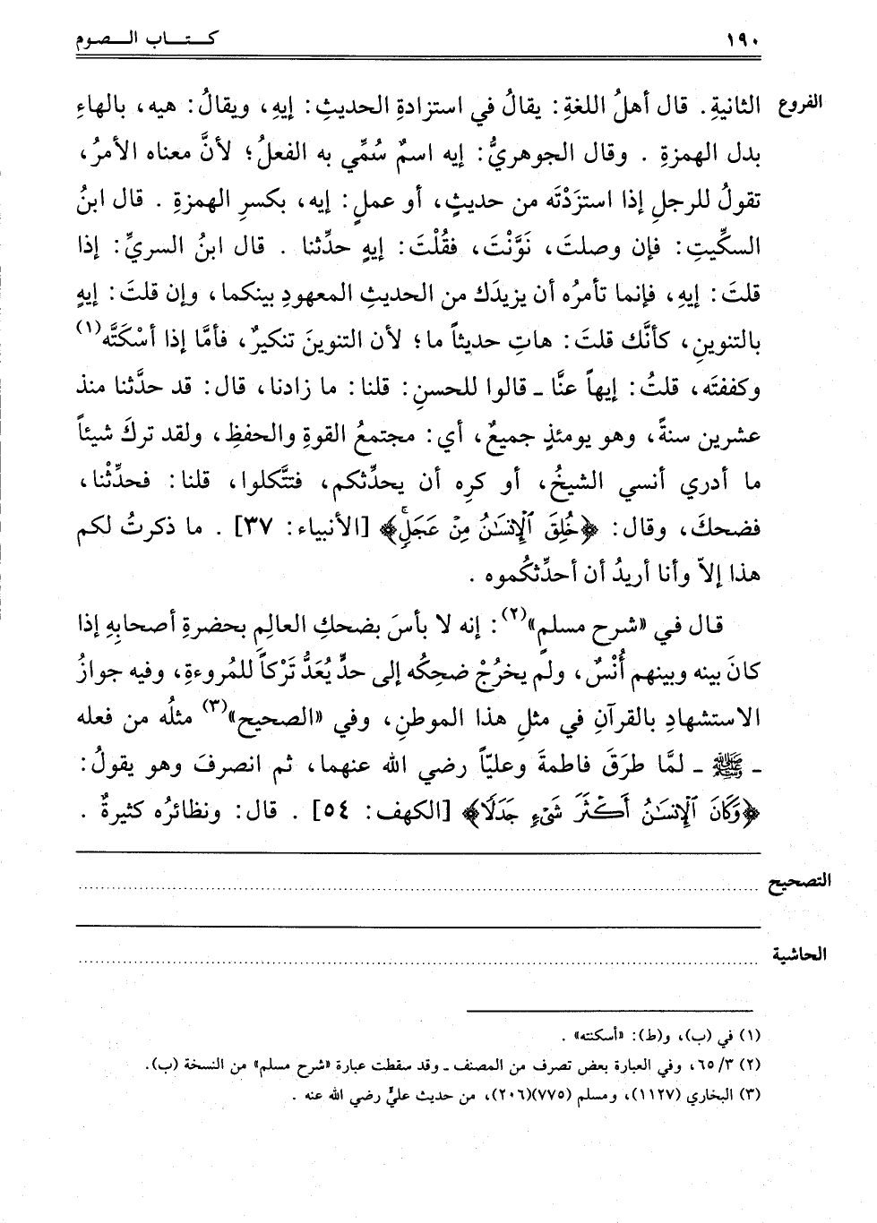 الثَّانِيَةِ, قَالَ أَهْلُ اللُّغَةِ: يُقَالُ فِي اسْتِزَادَةِ الْحَدِيثِ: إيهِ, وَيُقَالُ هِيهِ بِالْهَاءِ بَدَلَ الْهَمْزَةِ, قَالَ الْجَوْهَرِيُّ: إيهِ اسْمٌ سُمِّيَ بِهِ الْفِعْلُ لِأَنَّ مَعْنَاهُ الْأَمْرُ, تَقُولُ لِلرَّجُلِ إذَا اسْتَزَدْتَهُ مِنْ حَدِيثٍ أَوْ عَمَلٍ: إيهِ بِكَسْرِ الْهَمْزَةِ, قَالَ ابْنُ السِّكِّيتِ: فَإِنْ وَصَلْت نَوَّنْت فَقُلْت إيهٍ حَدِّثْنَا, قَالَ ابْنُ السَّرِيِّ: إذَا قُلْت إيهِ, فَإِنَّمَا تَأْمُرُهُ أَنْ يَزِيدَك مِنْ الْحَدِيثِ الْمَعْهُودِ بَيْنكُمَا وَإِنْ قُلْت إيهٍ بِالتَّنْوِينِ, كَأَنَّك قُلْت: هَاتِ حَدِيثًا مَا, لِأَنَّ التَّنْوِينَ تَنْكِيرٌ, فَأَمَّا إذَا أَسْكَنْتَهُ1 وَكَفَفْتَهُ قُلْتَ: إلَيْهَا عَنَّا قَالُوا لِلْحَسَنِ: قُلْنَا مَا زَادَنَا, قَالَ: قَدْ حَدَّثَنَا مُنْذُ عِشْرِينَ سَنَةً وَهُوَ يَوْمَئِذٍ جَمِيعٌ, أَيْ مُجْتَمَعُ الْقُوَّةِ وَالْحِفْظِ, وَلَقَدْ تَرَكَ شَيْئًا مَا أَدْرِي أَنَسِيَ الشَّيْخُ أَوْ كَرِهَ أَنْ يُحَدَّثَكُمْ فَتَتَّكِلُوا, قُلْنَا: فَحَدِّثْنَا, فَضَحِكَ وَقَالَ: {خُلِقَ الْأِنْسَانُ مِنْ عَجَلٍ} [الأنبياء: 37] مَا ذَكَرْت لَكُمْ هَذَا إلَّا وَأَنَا أُرِيدُ أَنْ أُحَدِّثَكُمُوهُ.