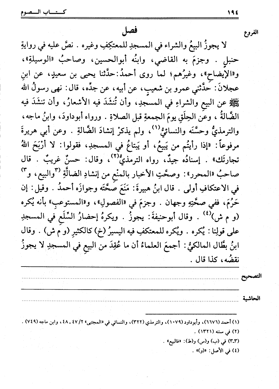 نَصَّ عَلَيْهِ فِي رِوَايَةِ حَنْبَلٍ, وَجَزَمَ بِهِ الْقَاضِي وَابْنُهُ أَبُو الْحُسَيْنِ وَصَاحِبُ الْوَسِيلَةِ وَالْإِفْصَاحِ وَغَيْرُهُمْ, كَمَا رَوَى أَحْمَدُ: حَدَّثَنَا يَحْيَى بْنُ سَعِيدٍ عَنْ ابْنِ عَجْلَانَ حَدَّثَنِي عَمْرِو بْنِ شُعَيْبٍ عَنْ أَبِيهِ عَنْ جَدِّهِ قَالَ: نَهَى رَسُولُ اللَّهِ صَلَّى اللَّهُ عَلَيْهِ وَسَلَّمَ عَنْ الْبَيْعِ وَالشِّرَاءِ فِي الْمَسْجِدِ, وَأَنْ تُنْشَدَ فِيهِ الْأَشْعَارُ, وَأَنْ تُنْشَدَ فِيهِ الضَّالَّةُ, وَعَنْ الْحِلَقِ يَوْمَ الْجُمُعَةِ قَبْلَ الصَّلَاةِ. وَرَوَاهُ أَبُو دَاوُد وَابْنُ مَاجَهْ, وَالتِّرْمِذِيُّ وَحَسَّنَهُ, وَالنَّسَائِيُّ1 وَلَمْ يَذْكُرْ إنْشَادَ الضَّالَّةِ. وَعَنْ أَبِي هُرَيْرَةَ مَرْفُوعًا "إذَا رَأَيْتُمْ مَنْ يَبِيعُ أَوْ يَبْتَاعُ فِي الْمَسْجِدِ فَقُولُوا: لَا أَرْبَحَ اللَّهُ تِجَارَتَك" إسْنَادُهُ جَيِّدٌ, رَوَاهُ التِّرْمِذِيُّ2 وَقَالَ: حَسَنٌ غَرِيبٌ. قَالَ صَاحِبُ الْمُحَرَّرِ: وَصَحَّتْ الْأَخْبَارُ بِالْمَنْعِ مِنْ إنشاد الضالة, 3والبيع و3 الِاعْتِكَافِ أَوْلَى, قَالَ ابْنُ هُبَيْرَةَ: مَنَعَ صِحَّتَهُ وَجَوَّزَهُ أَحْمَدُ, وَقِيلَ: إنْ حُرِّمَ فَفِي صِحَّتِهِ وَجْهَانِ, وَجَزَمَ فِي الْفُصُولِ وَالْمُسْتَوْعِبِ بِأَنَّهُ يُكْرَهُ "وم ش"4 وَقَالَ أَبُو حَنِيفَةَ يَجُوزُ. وَيُكْرَهُ إحْضَارُ السِّلَعِ فِي الْمَسْجِدِ عَلَى قَوْلِنَا يُكْرَهُ وَيُكْرَهُ لِلْمُعْتَكِفِ فِيهِ الْيَسِيرُ "خ" كَالْكَثِيرِ "وَ" وَقَالَ ابْنُ بَطَّالٍ الْمَالِكِيُّ: أَجْمَعَ الْعُلَمَاءُ أَنَّ مَا عُقِدَ مِنْ الْبَيْعِ فِي الْمَسْجِد لَا يجوز نقضه, كذا قال,