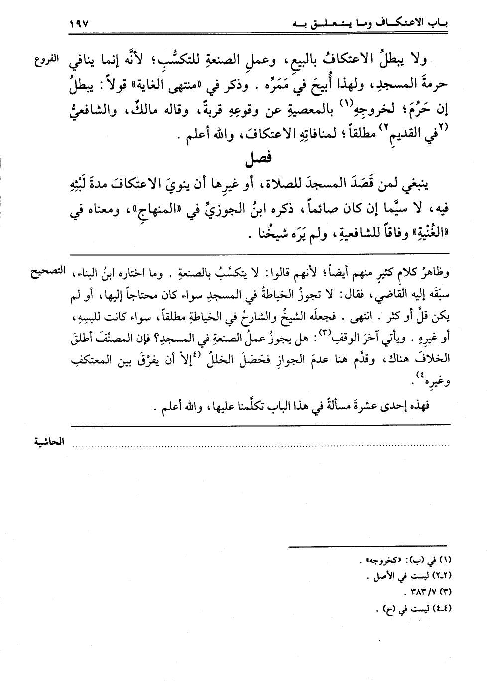 ـــــــــــــــــــــــــــــQوَظَاهِرُ كَلَامِ كَثِيرٍ مِنْهُمْ أَيْضًا, لِأَنَّهُمْ قَالُوا: لَا يَتَكَسَّبُ بِالصَّنْعَةِ, وَمَا اخْتَارَهُ ابْنُ الْبَنَّاءِ سَبَقَهُ إلَيْهِ الْقَاضِي فَقَالَ: لَا تَجُوزُ الْخِيَاطَةُ فِي الْمَسْجِدِ سَوَاءٌ كَانَ مُحْتَاجًا إلَيْهَا أَوْ لَمْ يَكُنْ, قَلَّ أَوْ كَثُرَ, انْتَهَى, فَجَعَلَهُ الشَّيْخُ وَالشَّارِحُ فِي الْخِيَاطَةِ مُطْلَقًا سَوَاءٌ كَانَتْ لِلُبْسِهِ أَوْ غَيْرِهِ, وَيَأْتِي آخِرَ الْوَقْفِ3 هَلْ يَجُوزُ عَمَلُ الصَّنْعَةِ فِي الْمَسْجِدِ؟ فَإِنَّ الْمُصَنِّفَ أَطْلَقَ الْخِلَافَ هُنَاكَ, وَقَدَّمَ هُنَا عَدَمَ الْجَوَازِ فَحَصَلَ الْخَلَلُ 4إلَّا أَنْ يُفَرَّقَ بَيْنَ الْمُعْتَكِفِ وَغَيْرِهِ4.