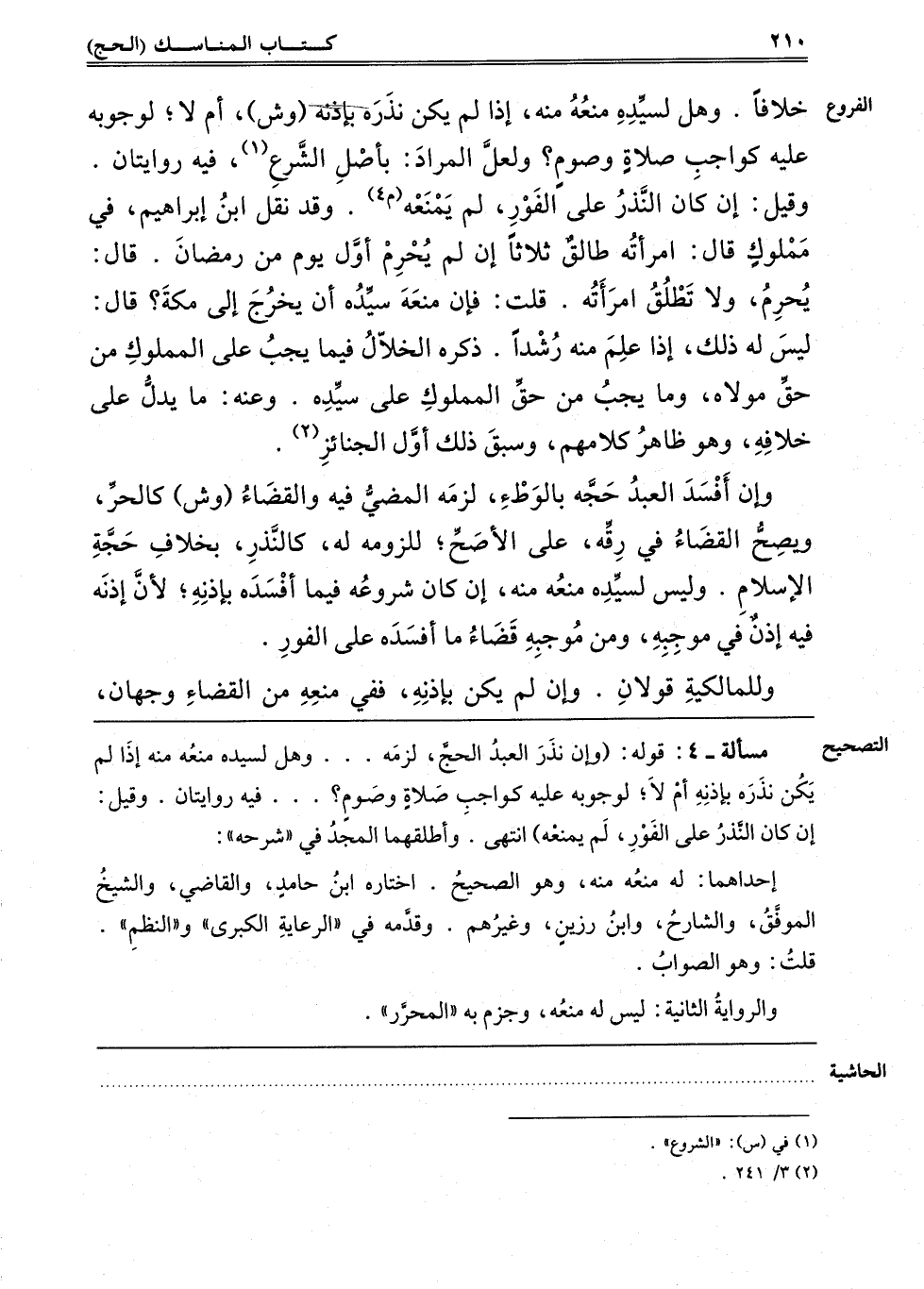 خِلَافًا, وَهَلْ لِسَيِّدِهِ مَنْعُهُ مِنْهُ إذَا لَمْ يكن نذره بإذنه "وش" أَمْ لَا؟ لِوُجُوبِهِ عَلَيْهِ كَوَاجِبِ صَلَاةٍ وَصَوْمٍ ولعل المراد بأصل الشرع1 فِيهِ رِوَايَتَانِ. وَقِيلَ: إنْ كَانَ النَّذْرُ عَلَى الْفَوْرِ لَمْ يَمْنَعْهُ "م 4" وَقَدْ نَقَلَ ابْنُ إبْرَاهِيمَ فِي مَمْلُوكٍ قَالَ: امْرَأَتُهُ طَالِقٌ ثَلَاثًا إنْ لَمْ يُحْرِمْ أَوَّلَ يَوْمٍ مِنْ رَمَضَانَ, قَالَ: يُحْرِمُ وَلَا تَطْلُقُ امْرَأَتُهُ, قُلْت: فَإِنْ مَنَعَهُ سَيِّدُهُ أَنْ يَخْرُجَ إلَى مَكَّةَ؟ قَالَ: لَيْسَ لَهُ ذَلِكَ إذَا عَلِمَ مِنْهُ رُشْدًا. ذَكَرَهُ الْخَلَّالُ فِيمَا يَجِبُ عَلَى الْمَمْلُوكِ مِنْ حَقِّ مَوْلَاهُ وَمَا يَجِبُ مِنْ حَقِّ الْمَمْلُوكِ عَلَى سَيِّدِهِ. وَعَنْهُ مَا يَدُلُّ عَلَى خِلَافِهِ, وَهُوَ ظَاهِرُ كَلَامِهِمْ, وَسَبَقَ ذَلِكَ أَوَّلَ الْجَنَائِزِ2.