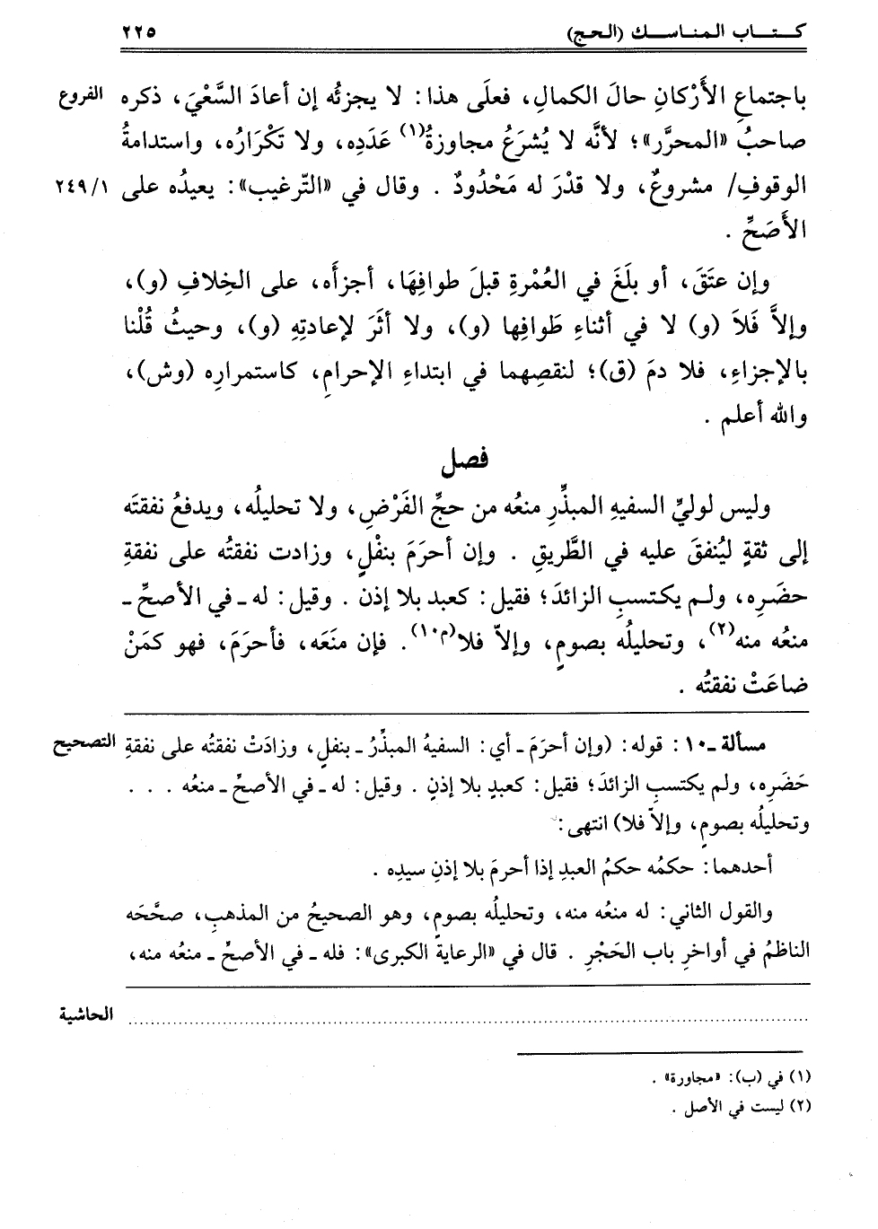 ـــــــــــــــــــــــــــــQ"مَسْأَلَةٌ 10" قَوْلُهُ: وَإِنْ أَحْرَمَ أَيْ السَّفِيهُ الْمُبَذِّرُ بِنَفْلٍ وَزَادَتْ نَفَقَتُهُ عَلَى نَفَقَةِ حَضَرِهِ وَلَمْ يَكْتَسِبْ الزَّائِدَ فَقِيلَ كَعَبْدٍ بِلَا إذْنٍ, وَقِيلَ: لَهُ فِي الْأَصَحِّ مَنْعُهُ.