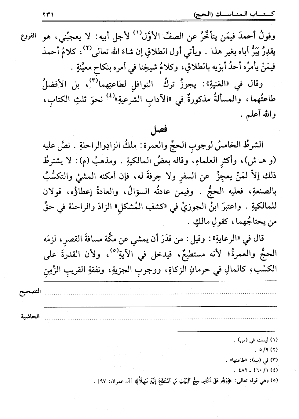 فَصْلٌ: الشَّرْطُ الْخَامِسُ لِوُجُوبِ الْحَجِّ وَالْعُمْرَةِ مِلْكُ الزاد والراحلة,
