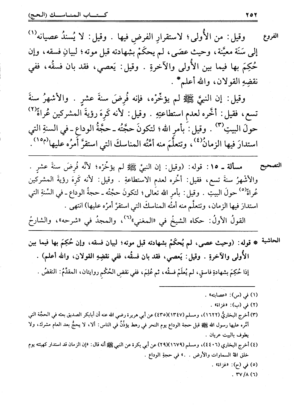 وَقِيلَ: مِنْ الْأُولَى, لِاسْتِقْرَارِ الْفَرْضِ فِيهَا, وَقِيلَ: لَا يُسْنَدُ عِصْيَانُهُ1 إلَى سَنَةٍ مُعَيَّنَةٍ, وَحَيْثُ عَصَى لَمْ يُحْكَمْ بِشَهَادَتِهِ قَبْلَ مَوْتِهِ, لِبَيَانِ فِسْقِهِ, وَإِنْ حُكِمَ بِهَا فِيمَا بَيْنَ الْأُولَى وَالْآخِرَةِ. وَقِيلَ: يَعْصِي, فَقَدْ بَانَ فِسْقُهُ, فَفِي نَقْضِهِ الْقَوْلَانِ. وَاَللَّهُ أَعْلَمُ.