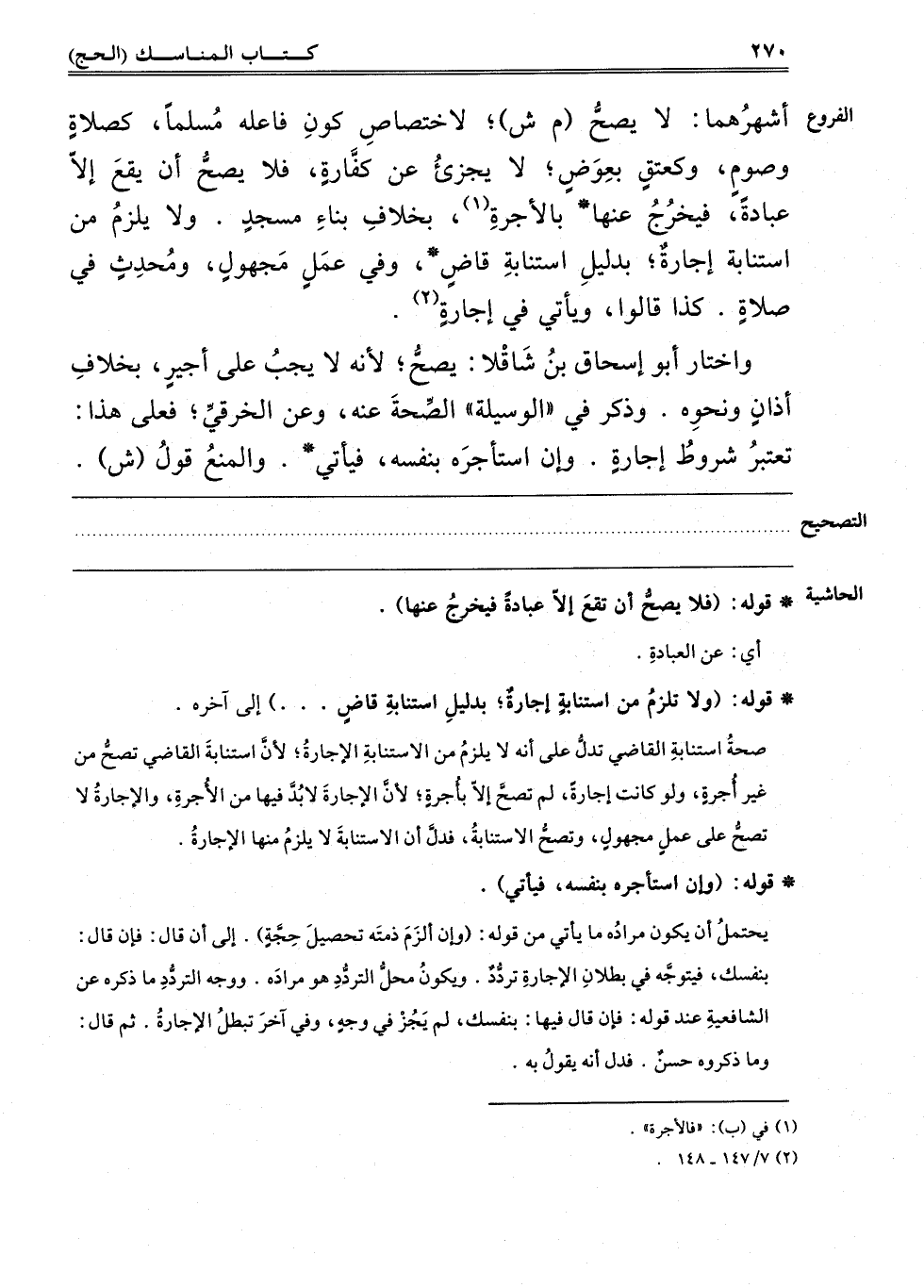 أَشْهَرُهُمَا لَا يَصِحُّ "م ش" لِاخْتِصَاصِ كَوْنِ فَاعِلِهِ مُسْلِمًا, كَصَلَاةٍ وَصَوْمٍ وَكَعِتْقٍ بِعِوَضٍ لَا يُجْزِئُ عَنْ كَفَّارَةٍ, فَلَا يَصِحُّ أَنْ يَقَعَ إلَّا عِبَادَةً, فَيَخْرُجَ عَنْهَا بِالْأُجْرَةِ1, بِخِلَافِ بِنَاءِ مَسْجِدٍ, وَلَا يَلْزَمُ مِنْ اسْتِنَابَةٍ إجَارَةٌ, بِدَلِيلِ اسْتِنَابَةِ قَاضٍ وَفِي عَمَلِ مَجْهُولٍ وَمُحْدِثٍ فِي صَلَاةٍ, كَذَا قَالُوا, وَيَأْتِي فِي إجَارَةٍ2.