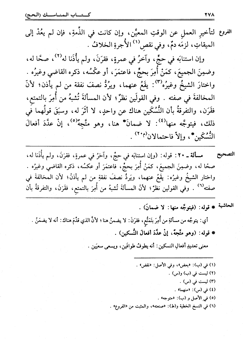 وَإِنْ اسْتَنَابَهُ "وَاحِدٌ" فِي حَجٍّ وَآخَرُ فِي عُمْرَةٍ فَقَرَنَ وَلَمْ يَأْذَنَا "لَهُ"2 صَحَّا لَهُ وضمن الجميع, كمن أمر بحج فاعتمر أو عَكْسِهِ, ذَكَرَهُ الْقَاضِي وَغَيْرُهُ, وَاخْتَارَ الشَّيْخُ وَغَيْرُهُ3: يَقَعُ عَنْهُمَا وَيَرُدُّ نِصْفَ نَفَقَةِ مَنْ لَمْ يَأْذَنْ, لِأَنَّ الْمُخَالَفَةَ فِي صِفَتِهِ, وَفِي الْقَوْلَيْنِ نَظَرٌ, لِأَنَّ الْمَسْأَلَةَ تُشْبِهُ مَنْ أُمِرَ بِالتَّمَتُّعِ فَقَرَنَ, وَالتَّفْرِقَةُ بِأَنَّ النُّسُكَيْنِ هُنَاكَ عَنْ وَاحِدٍ لَا أَثَرَ لَهُ. وَسَبَقَ قَوْلُهُمَا فِي ذَلِكَ, فَيَتَوَجَّهُ مِنْهَا4: لَا ضَمَانَ هُنَا, وَهُوَ مُتَّجِهٌ5 إنْ عَدَّدَ أَفْعَالَ النُّسُكَيْنِ وَإِلَّا فَاحْتِمَالَانِ "م 20".