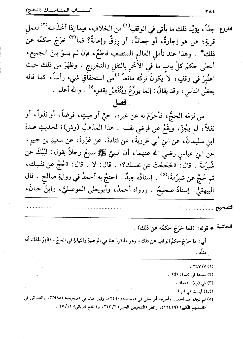 حَيٍّ أَوْ مَيِّتٍ فَرْضًا أَوْ نَذْرًا أَوْ نَفْلًا لَمْ يَجُزْ وَيَقَعُ عَنْ فَرْضِ نَفْسِهِ, هَذَا الْمَذْهَبُ "وش" لِحَدِيثِ عَبْدَةَ بْنِ سُلَيْمَانَ عَنْ ابْنِ أَبِي عَرُوبَةَ عَنْ قَتَادَةَ عَنْ عُزْرَةَ عَنْ سَعِيدِ بْنِ جُبَيْرٍ عَنْ ابْنِ عَبَّاسٍ "رَضِيَ اللَّهُ عَنْهُمَا" أَنَّ النَّبِيَّ صَلَّى اللَّهُ عَلَيْهِ وَسَلَّمَ سَمِعَ رَجُلًا يَقُولُ: لَبَّيْكَ عَنْ شُبْرُمَةَ, قَالَ: "حَجَجْت عَنْ نَفْسِك"؟ قَالَ: لَا, قَالَ: "حُجَّ عَنْ نَفْسِك ثُمَّ حُجَّ عَنْ شُبْرُمَةَ" 5 إسْنَادُهُ جَيِّدٌ, احْتَجَّ بِهِ أَحْمَدُ فِي رِوَايَةِ صَالِحٍ, قَالَ الْبَيْهَقِيُّ: إسْنَادٌ صَحِيحٌ, وَرَوَاهُ أَحْمَدُ وَأَبُو يَعْلَى الْمَوْصِلِيُّ وَابْنُ حبان