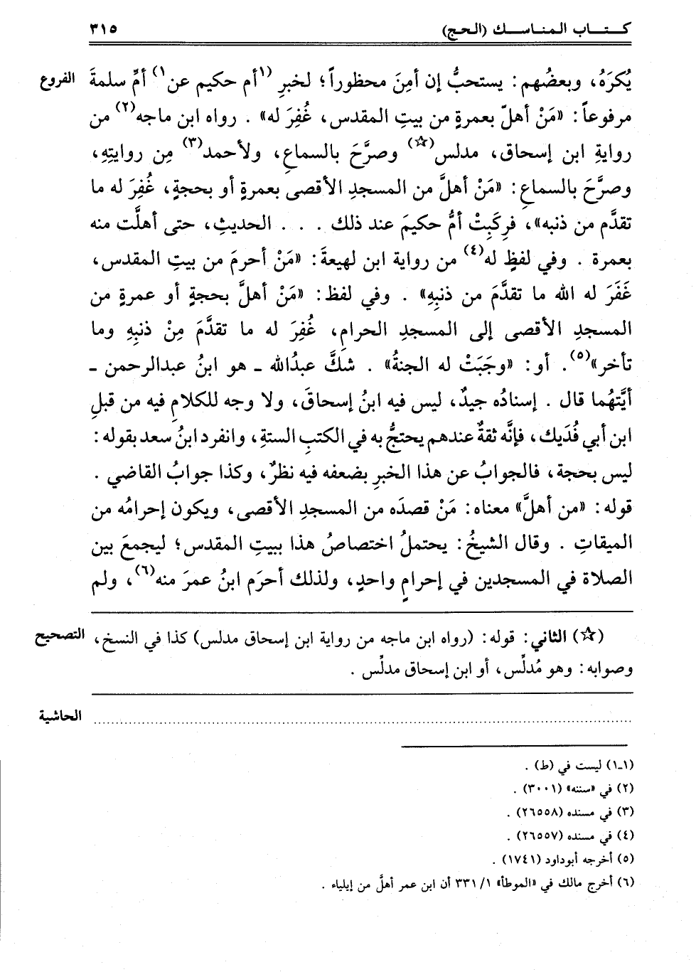 يَكْرَهُ, وَبَعْضُهُمْ: يَسْتَحِبُّ إنْ أَمِنَ مَحْظُورًا, لِخَبَرِ "1أم حكيم عن1" أُمِّ سَلَمَةَ مَرْفُوعًا "مَنْ أَهَلَّ بِعُمْرَةٍ مِنْ بَيْتِ الْمَقْدِسِ غُفِرَ لَهُ" رَوَاهُ ابْنُ مَاجَهْ2 مِنْ رِوَايَةِ ابْنِ إِسْحَاقَ مُدَلِّسِ "الْحَدِيثِ" وَصَرَّحَ بِالسَّمَاعِ وَلِأَحْمَدَ3 مِنْ رِوَايَتِهِ وَصَرَّحَ بِالسَّمَاعِ "مَنْ أَهَلَّ مِنْ الْمَسْجِدِ الْأَقْصَى بِعُمْرَةٍ أَوْ بِحَجَّةٍ غُفِرَ لَهُ مَا تَقَدَّمَ مِنْ ذَنْبِهِ" فَرَكِبَتْ أُمُّ حَكِيمٍ عَنْ ذَلِكَ الْحَدِيثِ حَتَّى أَهَلَّتْ مِنْهُ بِعُمْرَةٍ. وَفِي لَفْظٍ لَهُ4 مِنْ رِوَايَةٍ ابْنِ لَهِيعَةَ "مَنْ أَحْرَمَ مِنْ بَيْتِ الْمَقْدِسِ غَفَرَ لَهُ اللَّهُ مَا تَقَدَّمَ مِنْ ذَنْبِهِ" وَفِي لَفْظِ "مَنْ أَهَلَّ بِحَجَّةٍ أَوْ عُمْرَةٍ مِنْ الْمَسْجِدِ الْأَقْصَى إلَى الْمَسْجِدِ الْحَرَامِ غُفِرَ لَهُ مَا تَقَدَّمَ مِنْ ذَنْبِهِ وَمَا تَأَخَّرَ" 5 أَوْ "وَجَبَتْ لَهُ الْجَنَّةُ" شَكَّ عَبْدُ اللَّهِ هُوَ ابْنُ عَبْدِ الرَّحْمَنِ أَيَّتَهمَا قَالَ: إسْنَادُهُ جَيِّدٌ, لَيْسَ فِيهِ ابْنُ إِسْحَاقَ, وَلَا وَجْهَ لِلْكَلَامِ فِيهِ مِنْ قِبَلِ ابْنِ أَبِي فُدَيْكٍ, فَإِنَّهُ ثِقَةٌ عِنْدَهُمْ يُحْتَجُّ بِهِ فِي الْكُتُبِ السِّتَّةِ, وَانْفَرَدَ ابْنُ سَعْدٍ بِقَوْلِهِ: لَيْسَ بِحُجَّةٍ, فالجواب عن هذا الخبر. بِتَضْعِيفِهِ نَظَرٌ, وَكَذَا جَوَابُ الْقَاضِي: قَوْلُهُ: "مَنْ أَهَلَّ" مَعْنَاهُ: مَنْ قَصْدَهُ مِنْ الْمَسْجِدِ الْأَقْصَى وَيَكُونُ إحْرَامُهُ مِنْ الْمِيقَاتِ. وَقَالَ الشَّيْخُ: يَحْتَمِلُ اخْتِصَاصَ هَذَا بِبَيْتِ الْمَقْدِسِ لِيَجْمَعَ بَيْنَ الصَّلَاةِ فِي الْمَسْجِدَيْنِ بِإِحْرَامٍ وَاحِدٍ, وَلِذَلِكَ أَحْرَمَ ابْنُ عمر منه6 ولم