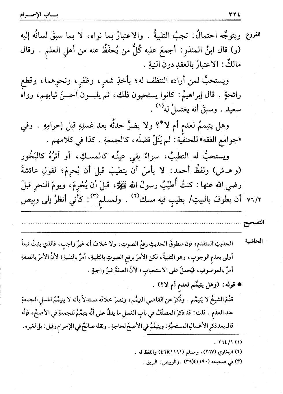 وَيُسْتَحَبُّ لَهُ التَّطَيُّبُ, سَوَاءً بَقِيَ عَيْنُهُ. كَالْمِسْكِ, أَوْ أَثَرُهُ كَالْبَخُورِ "وهـ ش" وَلَفْظُ أَحْمَدَ, لَا بَأْسَ أَنْ يَتَطَيَّبَ قَبْلَ أَنْ يُحْرِمَ, لِقَوْلِ عَائِشَةَ رَضِيَ اللَّهُ عَنْهَا كُنْت أُطَيِّبُ رَسُولَ اللَّه صَلَّى اللَّهُ عَلَيْهِ وَسَلَّمَ قَبْلَ أَنْ يُحْرِمَ, وَيَوْمَ النَّحْرِ قَبْلَ أَنْ يَطُوفَ بِالْبَيْتِ بِطِيبٍ فِيهِ مِسْكٌ2. ولمسلم3: كأني أنظر إلى وبيص