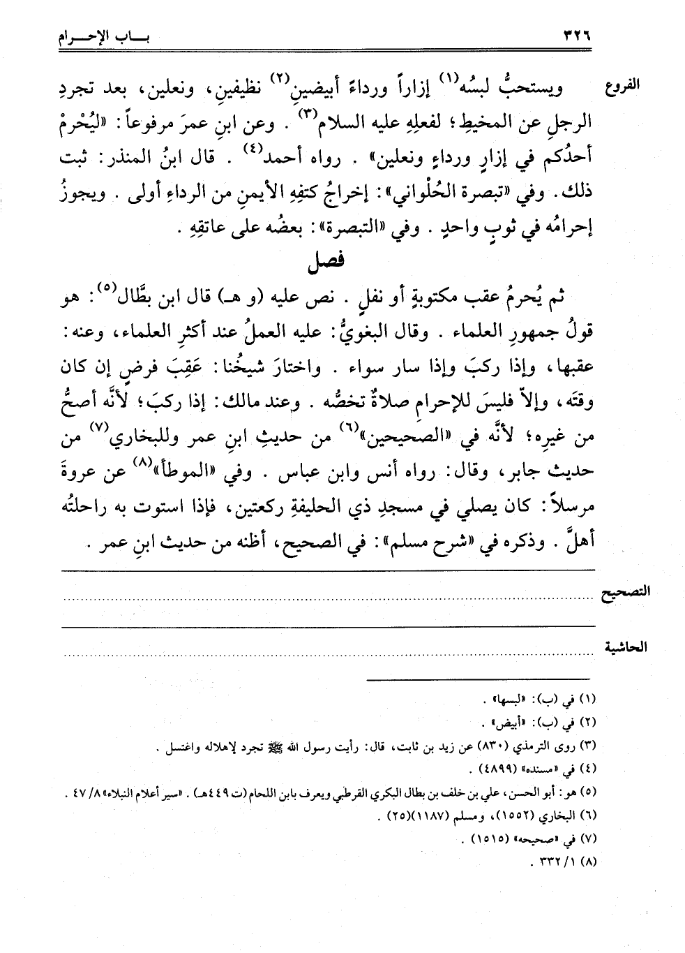 وَيُسْتَحَبُّ لُبْسُهُ1 إزَارًا وَرِدَاءً أَبْيَضَيْنِ2 نَظِيفِينَ, وَنَعْلَيْنِ, بَعْدَ تَجَرُّدِ الرَّجُلِ عَنْ الْمَخِيطِ, لَفِعْلِهِ عَلَيْهِ السَّلَامُ3, وَعَنْ ابْنِ عُمَرَ مَرْفُوعًا "لِيُحْرِمْ أَحَدُكُمْ فِي إزَارٍ وَرِدَاءٍ وَنَعْلَيْنِ" رَوَاهُ أَحْمَدُ4, قَالَ ابْنُ الْمُنْذِرِ: ثَبَتَ ذَلِكَ. وَفِي تَبْصِرَةِ الْحَلْوَانِيِّ: إخْرَاجُ كَتِفِهِ الْأَيْمَنِ مِنْ الرِّدَاءِ أَوْلَى, وَيَجُوزُ إحْرَامُهُ فِي ثَوْبٍ وَاحِدٍ. وَفِي التَّبْصِرَةِ: بَعْضُهُ على عاتقه.