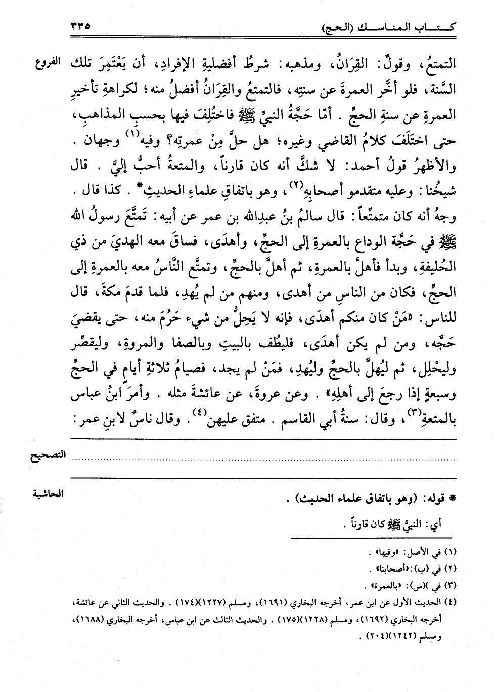 4 الحديث الأول عن ابن عمر أخرجه البخاري "1691" ومسلم "1227" "174" والحديث الثاني عن عائشة أخرجه البخاري "1692" ومسلم "1228" "175" والحديث عن ابن عباس أخرجه البخاري "1688" ومسلم "1242" "204".