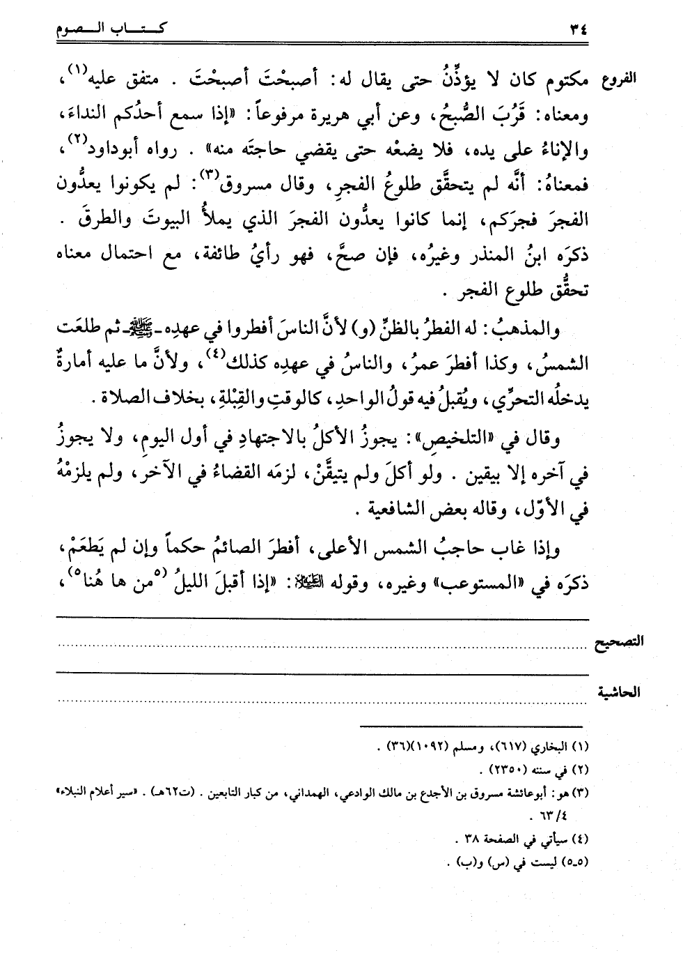 مَكْتُومٍ كَانَ لَا يُؤَذِّنُ حَتَّى يُقَالَ لَهُ: أَصْبَحْت أَصْبَحْت. مُتَّفَقٌ عَلَيْهِ1, وَمَعْنَاهُ قَرُبَ الصُّبْحُ وَعَنْ أَبِي هُرَيْرَةَ مَرْفُوعًا: "إذَا سَمِعَ أَحَدُكُمْ النِّدَاءَ وَالْإِنَاءُ عَلَى يَدِهِ فَلَا يَضَعْهُ حَتَّى يقضي حاجته منه" رواه أبو داود2, فَمَعْنَاهُ أَنَّهُ لَمْ يَتَحَقَّقْ طُلُوعُ الْفَجْرِ. وَقَالَ مَسْرُوقٌ3: لَمْ يَكُونُوا يَعُدُّونَ الْفَجْرَ فَجْرَكُمْ, إنَّمَا كَانُوا يَعُدُّونَ الْفَجْرَ الَّذِي يَمْلَأُ الْبُيُوتَ وَالطُّرُقَ. ذَكَرَهُ ابْنُ الْمُنْذِرِ وَغَيْرُهُ, فَإِنْ صَحَّ فَهُوَ رَأْيُ طَائِفَةٍ, مَعَ احْتِمَالِ مَعْنَاهُ تَحَقُّقُ طُلُوعِ الْفَجْرِ.