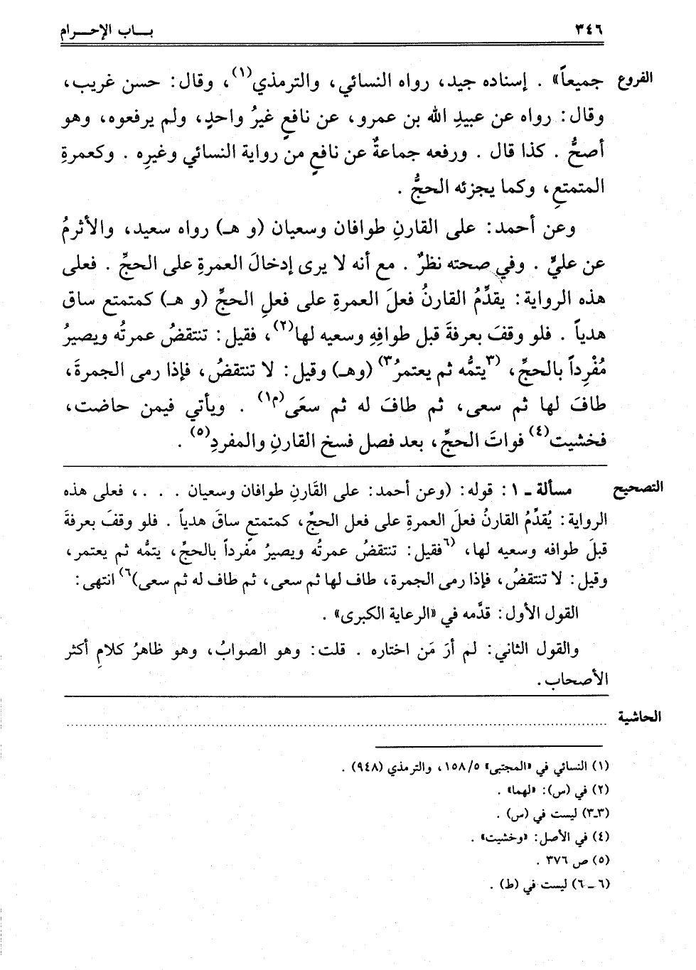 ـــــــــــــــــــــــــــــQ"مَسْأَلَةٌ 1" قَوْلُهُ: وَعَنْ أَحْمَدَ: عَلَى الْقَارِنِ طَوَافَانِ وَسَعَيَانِ فَعَلَى هَذِهِ الرِّوَايَةِ يُقَدِّمُ الْقَارِنُ فِعْلَ الْعُمْرَةِ عَلَى فِعْلِ الْحَجِّ, كَمُتَمَتِّعٍ سَاقَ هَدْيًا, فَلَوْ وَقَفَ بِعَرَفَةَ قَبْلَ طَوَافِهِ وَسَعْيِهِ لَهَا ثُمَّ سَعَى ثُمَّ طَافَ لَهُ ثُمَّ سَعَى, انْتَهَى. "الْقَوْلُ الْأَوَّلُ" قَدَّمَهُ فِي الرِّعَايَةِ الْكُبْرَى.