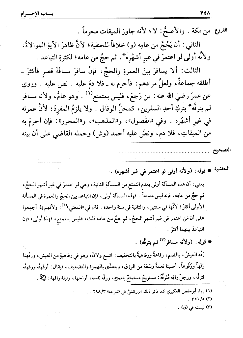 "الثَّالِثُ" أَنْ لَا يُسَافِرَ بَيْنَ الْعُمْرَةِ وَالْحَجِّ, فَإِنْ سَافَرَ مَسَافَةَ قَصْرٍ فَأَكْثَرَ أَطْلَقَهُ جَمَاعَةٌ, وَلَعَلَّ مُرَادُهُمْ: فَأَحْرَمَ بِهِ. فَلَا دَمَ عَلَيْهِ, نَصَّ "عَلَيْهِ" وَرُوِيَ عَنْ عُمَرَ رَضِيَ اللَّهُ عَنْهُ: مَنْ رَجَعَ فَلَيْسَ بِمُتَمَتِّعٍ1. وَهُوَ عَامٌّ; وَلِأَنَّهُ مُسَافِرٌ لَمْ يَتَرَفَّهْ بِتَرْكِ أَحَدِ السَّفَرَيْنِ كَمَحِلِّ الْوِفَاقِ. وَلَا يَلْزَمُ الْمُفْرِدَ; لِأَنَّ عُمْرَتَهُ فِي غَيْرِ أَشْهُرِهِ. وَفِي الْفُصُولِ وَالْمُذَهَّبِ وَالْمُحَرَّرِ: فَإِنْ أَحْرَمَ بِهِ مِنْ الْمِيقَاتِ فَلَا دَمَ. نَصَّ عَلَيْهِ أَحْمَدُ "وش" وَحَمَلَهُ الْقَاضِي عَلَى أَنَّ بَيْنَهُ