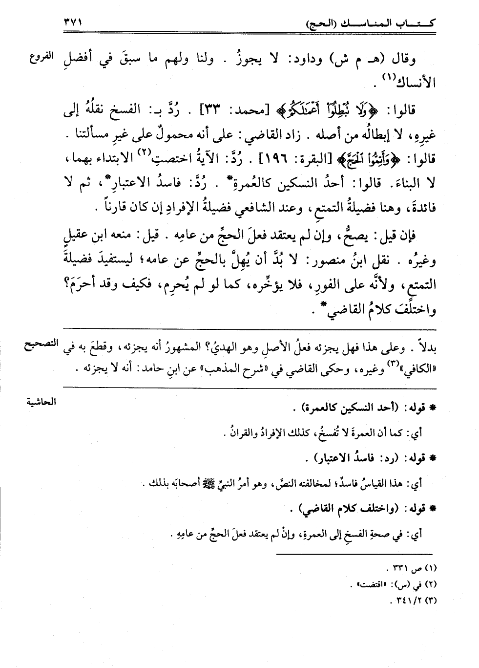 قَالُوا: {وَلا تُبْطِلُوا أَعْمَالَكُمْ} [محمد: 33] رُدَّ بِالْفَسْخِ, نَقَلَهُ إلَى غَيْرِهِ لَا إبْطَالُهُ, مِنْ أَصْلِهِ, زَادَ الْقَاضِي: عَلَى أَنَّهُ مَحْمُولٌ عَلَى غَيْرِ مَسْأَلَتِنَا. قَالُوا: {وَأَتِمُّوا الْحَجَّ} [البقرة: 196] رُدَّ: الْآيَةَ اخْتَصَّتْ2 الِابْتِدَاءَ بِهِمَا لَا الْبِنَاءَ. قَالُوا: أَحَدُ النُّسُكَيْنِ كَالْعُمْرَةِ. رُدَّ: فَاسِدُ الِاعْتِبَارِ, ثُمَّ لَا فَائِدَةَ, وَهُنَا فَضِيلَةُ التَّمَتُّعِ, وَعِنْدَ الشَّافِعِيِّ فَضِيلَةُ الإفراد إن كان. قَارِنًا.