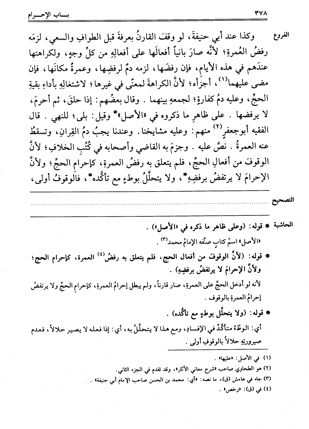 وَكَذَا عِنْدَ أَبِي حَنِيفَةَ لَوْ وَقَفَ الْقَارِنُ بِعَرَفَةَ قَبْلَ الطَّوَافِ وَالسَّعْيِ لَزِمَهُ رَفْضُ الْعُمْرَةِ; لِأَنَّهُ صَارَ بَانِيًا أَفْعَالَهَا عَلَى أَفْعَالِهِ مِنْ كُلِّ وَجْهٍ, وَلِكَرَاهَتِهَا عِنْدَهُمْ فِي هَذِهِ الْأَيَّامِ, فَإِنْ رَفَضَهَا لَزِمَهُ دَمٌ لِرَفْضِهَا وَعُمْرَةٌ مَكَانَهَا, فَإِنْ مَضَى عَلَيْهِمَا1 أَجْزَأَهُ, لِأَنَّ الْكَرَاهَةَ لِمَعْنًى فِي غَيْرِهَا, لِاشْتِغَالِهِ بِأَدَاءِ بَقِيَّةِ الْحَجِّ, وَعَلَيْهِ دَمُ كَفَّارَةٍ لِجَمْعِهِ بَيْنَهُمَا. وَقَالَ بَعْضُهُمْ: إذَا حَلَقَ لَهُ ثُمَّ أَحْرَمَ لَا يَرْفُضُهَا, عَلَى ظَاهِرِ مَا ذَكَرَهُ فِي الْأَصْلِ وَقِيلَ: بَلَى, لِلنَّهْيِ, قَالَ الْفَقِيهُ أَبُو جَعْفَرٍ2 مِنْهُمْ وَعَلَيْهِ مَشَايِخُنَا: وَعِنْدَنَا يَجِبُ دَمُ الْقِرَانِ وَتَسْقُطُ عَنْهُ الْعُمْرَةُ نَصَّ عَلَيْهِ. وَجَزَمَ بِهِ الْقَاضِي وَأَصْحَابُهُ فِي كُتُبِ الْخِلَافِ; لِأَنَّ الْوُقُوفَ مِنْ أَفْعَالِ الْحَجِّ, فَلَمْ يَتَعَلَّقْ بِهِ رَفْضُ الْعُمْرَةِ, كَإِحْرَامِ الْحَجِّ; وَلِأَنَّ الْإِحْرَامَ لَا يُرْتَفَضُ بِرَفْضِهِ, وَلَا يتحلل بوطء مع تأكده, فالوقوف أولى