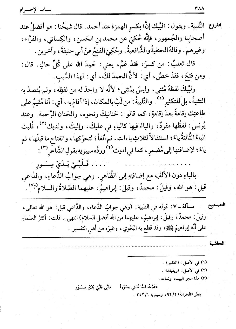 وَلَبَّيْكَ لَفْظُهُ مُثَنَّى, وَلَيْسَ بِمُثَنًّى, لِأَنَّهُ لَا وَاحِدَ لَهُ مِنْ لَفْظِهِ, وَلَمْ يَقْصِدْ بِهِ التَّثْنِيَةَ بَلْ لِلتَّكْثِيرِ1. وَالتَّلْبِيَةُ مِنْ لَبَّ بِالْمَكَانِ إذَا أَقَامَ بِهِ, أَيْ أَنَا مُقِيمٌ عَلَى طَاعَتِك إقَامَةً بَعْدَ إقَامَةٍ, كَمَا قَالُوا: حَنَانَيْكَ وَنَحْوَهُ, وَالْحَنَانُ الرَّحْمَةُ وَعِنْدَ يُونُسَ لَفْظُهَا مُفْرَدٌ, وَالْيَاءُ فِيهَا كَالْيَاءِ فِي عَلَيْك وَإِلَيْك وَلَدَيْك, قُلِّبَتْ الْبَاءُ الثَّالِثَةُ يَاءً اسْتِثْقَالًا لِثَلَاثِ بَاءَاتٍ, ثُمَّ أَلِفًا لِتَحَرُّكِهَا وَانْفِتَاحِ مَا قَبْلَهَا, ثُمَّ يَاءً لِإِضَافَتِهَا إلَى مُضْمَرٍ, كَمَا فِي لَدَيْكَ2, وَرَدَّهُ سِيبَوَيْهِ بِقَوْلِ الشَّاعِرِ3: