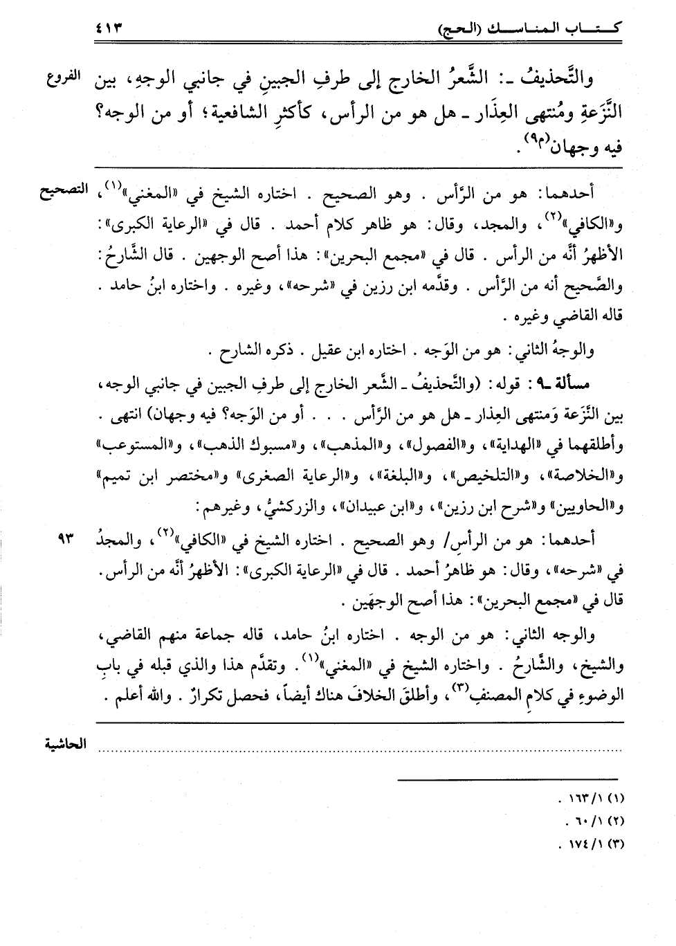"مَسْأَلَةٌ 9" قَوْلُهُ: وَالتَّحْذِيفُ الشَّعْرُ الْخَارِجُ إلَى طَرَفِ الجبين في جانبي الوجه بين النزعة ومنتهى الْعِذَارِ هَلْ هُوَ مِنْ الرَّأْسِ أَوْ مِنْ الْوَجْهِ؟ فِيهِ وَجْهَانِ, انْتَهَى. وَأَطْلَقَهُمَا فِي الْهِدَايَةِ وَالْفُصُولِ وَالْمُذْهَبِ وَمَسْبُوكِ الذَّهَبِ وَالْمُسْتَوْعِبِ وَالْخُلَاصَةِ وَالتَّلْخِيصِ وَالْبُلْغَةِ وَالرِّعَايَةِ الصُّغْرَى وَمُخْتَصَرِ ابْنِ تَمِيمٍ وَالْحَاوِيَيْنِ وَشَرْحِ ابْنِ رَزِينٍ وَابْنُ عُبَيْدَانَ وَالزَّرْكَشِيِّ وَغَيْرِهِمْ.