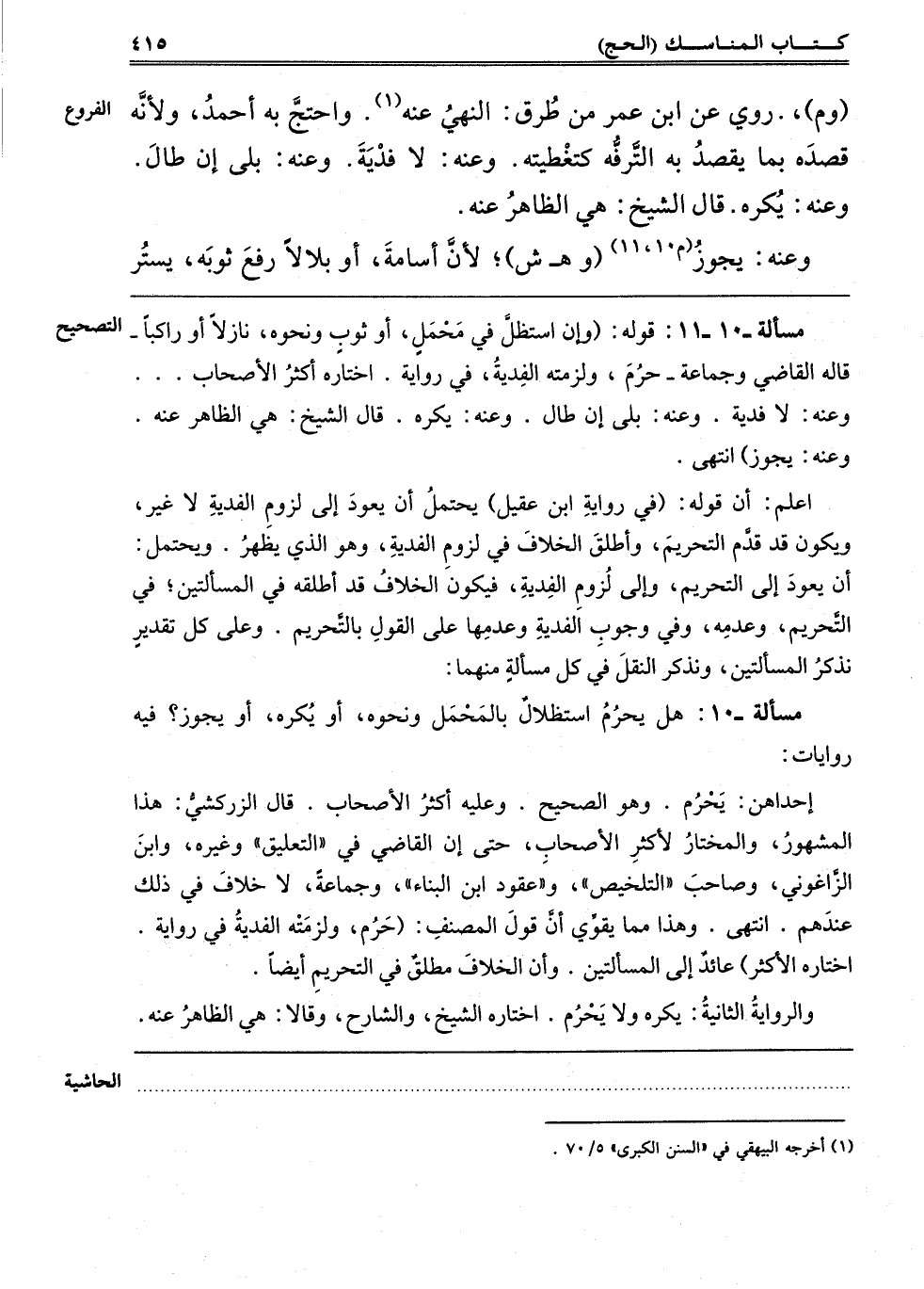 "الْمَسْأَلَةُ الْأُولَى 10" هَلْ يَحْرُمُ اسْتِظْلَالٌ بِالْمَحْمَلِ وَنَحْوِهِ, أَوْ يُكْرَهُ أَوْ يَجُوزُ؟ فِيهِ رِوَايَاتٌ:
