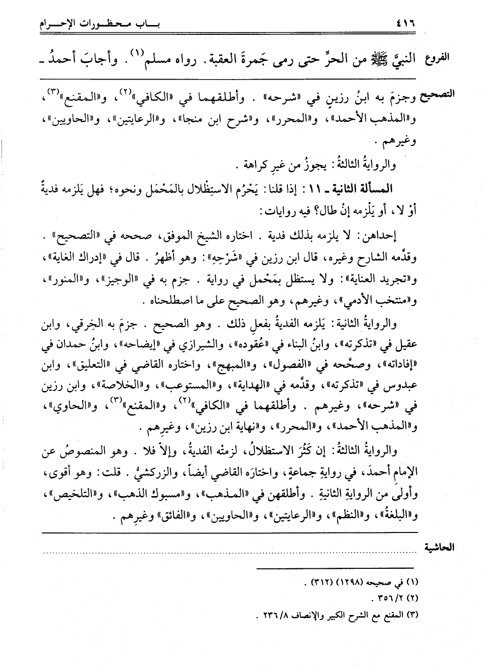 "وَالرِّوَايَةُ الثَّالِثَةُ" إنْ كَثُرَ الِاسْتِظْلَالُ لَزِمَتْهُ الْفِدْيَةُ, وَإِلَّا فَلَا, وَهُوَ الْمَنْصُوصُ عَنْ الْإِمَامِ أَحْمَدَ, فِي رِوَايَةُ جَمَاعَةٍ, وَاخْتَارَهُ الْقَاضِي أَيْضًا وَالزَّرْكَشِيُّ "قُلْتُ": وَهُوَ أَقْوَى وَأَوْلَى مِنْ الرِّوَايَةِ الثَّانِيَةِ, وَأَطْلَقَهُنَّ فِي الْمُذْهَبِ وَمَسْبُوكِ الذَّهَبِ وَالتَّلْخِيصِ وَالْبُلْغَةِ وَالنَّظْمِ وَالرِّعَايَتَيْنِ وَالْحَاوِيَيْنِ والفائق وغيرهم.