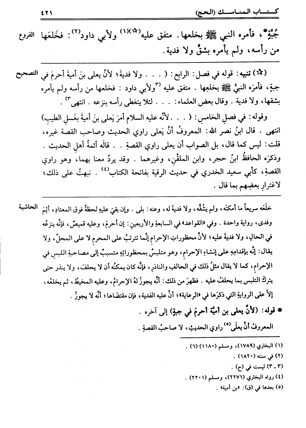 وَقَوْلُهُ فِي فَصْلٍ "الْخَامِسُ": لِأَنَّهُ عَلَيْهِ السَّلَامُ أَمَرَ يَعْلَى بْنَ أُمَيَّةَ بِغَسْلِ الطِّيبِ, انْتَهَى قَالَ: ابْنُ نَصْرِ اللَّهِ: الْمَعْرُوفُ أَنَّ يَعْلَى رَاوِي الْحَدِيثِ, وَصَاحِبَ الْقِصَّةِ غَيْرُهُ, انْتَهَى. "قُلْتُ", لَيْسَ كَمَا قَالَ: بَلْ الصَّوَابُ أَنَّهُ يَعْلَى رَاوِي الْقِصَّةِ. قَالَهُ أَئِمَّةُ أَهْلِ الْحَدِيثِ. وَذَكَرَهُ الْحَافِظُ ابْنُ حَجَرٍ وَابْنُ الْمُلَقَّنِ وَغَيْرُهُمَا وَقَدْ وَرَدَ مَعْنًى بِهِمَا وَهُوَ رَاوِي الْقِصَّةِ كَأَبِي سَعِيدٍ الْخُدْرِيِّ فِي حَدِيثِ الرُّقْيَةِ بِفَاتِحَةِ الْكِتَابِ4. نَبَّهْتُ عَلَى ذَلِكَ لِاغْتِرَارِ بَعْضِهِمْ بِمَا قَالَ.