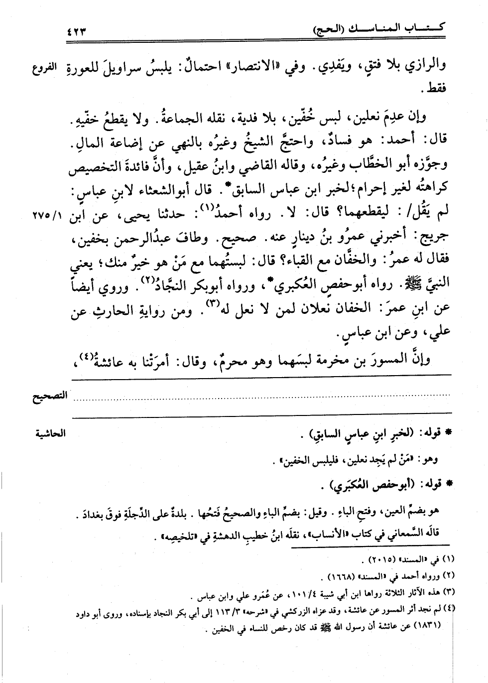 4 لم نجد أثر المسور عن عائشة وقد عزاه الزركشي في شرحه "3/113" إلى أبي بكر النجاد بإسناده وروى أبو داود "1831" عن عائشة أن رسول صلى عليه وسلم قد كان رخص للنساء في الخفين.