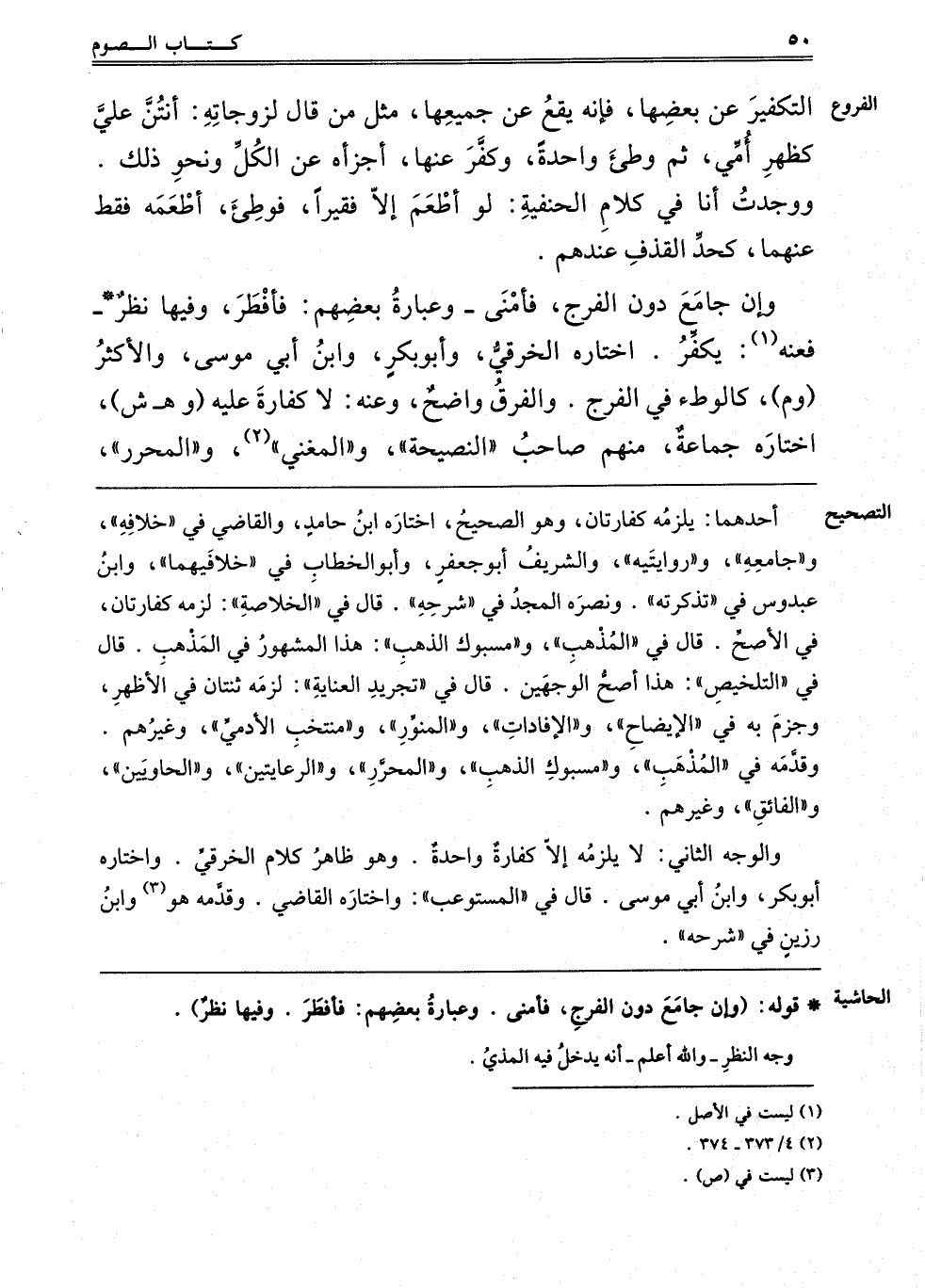 وَإِنْ جَامَعَ دُونَ الْفَرْجِ فَأَمْنَى وَعِبَارَةُ بَعْضِهِمْ: فَأَفْطَرَ, وَفِيهَا نَظَرٌ فَعَنْهُ1: يُكَفِّرُ, اخْتَارَهُ الْخِرَقِيُّ وَأَبُو بكر وابن أبي موسى والأكثر "وم" كَالْوَطْءِ فِي الْفَرْجِ, وَالْفَرْقُ وَاضِحٌ, وَعَنْهُ: لَا كفارة عليه "وهـ ش" اخْتَارَهُ جَمَاعَةٌ, مِنْهُمْ صَاحِبُ النَّصِيحَةِ وَالْمُغْنِي2 والمحرر,
