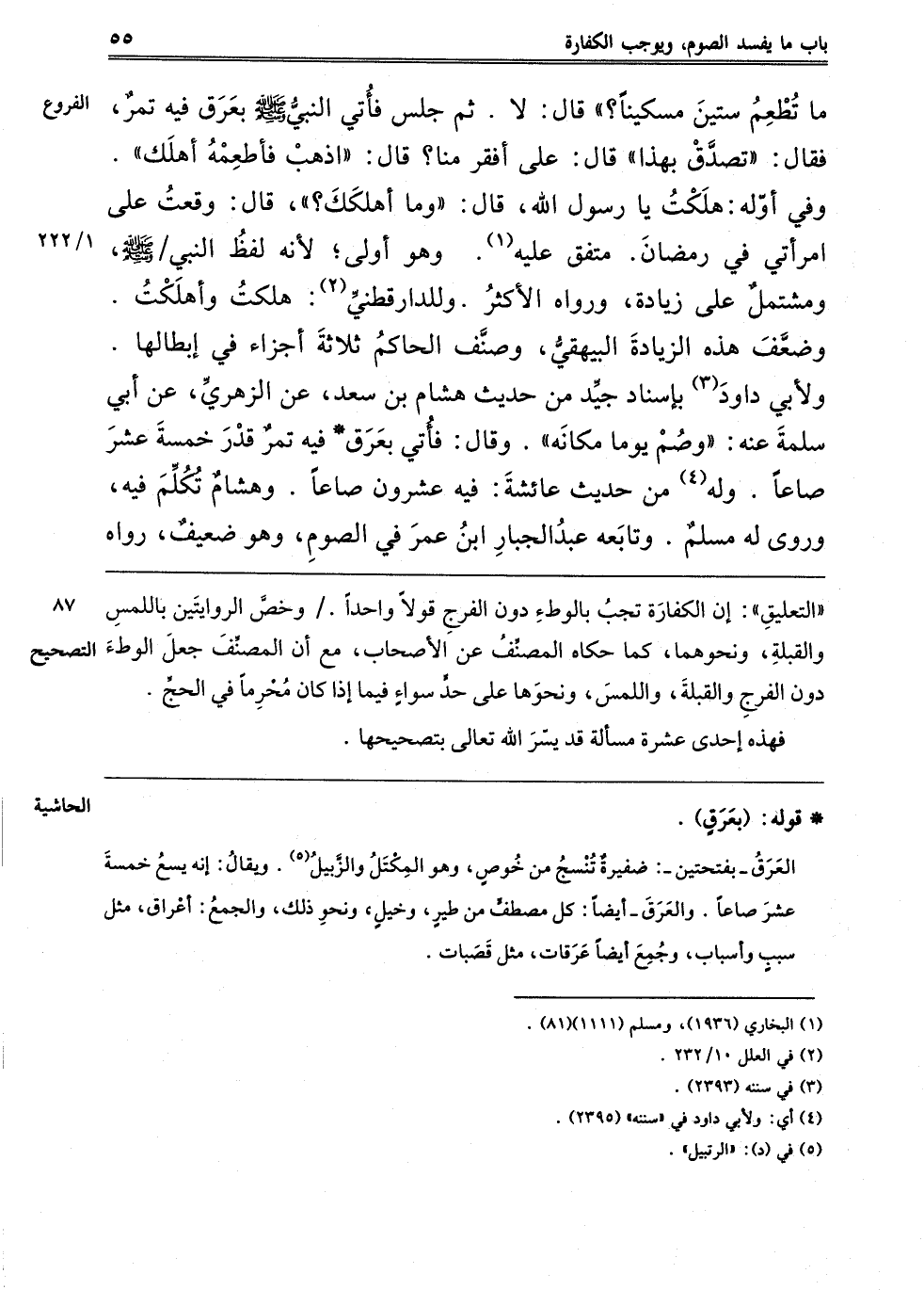 مَا تُطْعِمُ سِتِّينَ مِسْكِينًا؟ " قَالَ: لَا. ثُمَّ جَلَسَ فَأُتِيَ لِلنَّبِيِّ صَلَّى اللَّهُ عَلَيْهِ وَسَلَّمَ بِعَرَقٍ فِيهِ تَمْرٌ فَقَالَ: "تَصَدَّقْ بِهَذَا". قَالَ: عَلَى أَفْقَرَ مِنَّا؟ قَالَ: "اذْهَبْ فَأَطْعِمْهُ أَهْلَكَ" وَفِي أَوَّلِهِ: هَلَكْت يَا رَسُولَ اللَّهِ, قَالَ: "وَمَا أَهْلَكَك"؟ قَالَ: وَقَعْت عَلَى امْرَأَتِي فِي رَمَضَانَ. مُتَّفَقٌ عَلَيْهِ1, وَهُوَ أَوْلَى, لِأَنَّهُ لَفْظُ النَّبِيِّ صَلَّى اللَّهُ عَلَيْهِ وَسَلَّمَ, وَمُشْتَمِلٌ عَلَى زِيَادَةٍ, وَرَوَاهُ الْأَكْثَرُ, وَلِلدَّارَقُطْنِيِّ2: هَلَكْت وَأَهْلَكْت. وَضَعَّفَ هَذِهِ الزِّيَادَةَ الْبَيْهَقِيُّ, وَصَنَّفَ الْحَاكِمُ ثَلَاثَةَ أَجْزَاءٍ فِي إبْطَالِهَا. وَلِأَبِي دَاوُد3 بِإِسْنَادٍ جَيِّدٍ مِنْ حَدِيثِ هِشَامِ بْنِ سَعْدٍ عَنْ الزُّهْرِيِّ عَنْ أَبِي سَلَمَةَ عَنْهُ "وَصُمْ يَوْمًا مَكَانَهُ" وَقَالَ: فَأَتَى بِعَرَقٍ فِيهِ تَمْرٌ قَدْرَ خَمْسَةَ عَشَرَ صَاعًا, وَلَهُ4 مِنْ حَدِيثِ عَائِشَةَ: فِيهِ عِشْرُونَ صَاعًا, وَهِشَامٌ تَكَلَّمَ فِيهِ, وَرَوَى لَهُ مُسْلِمٌ, وَتَابَعَهُ عَبْدُ الْجَبَّارِ بْنُ عُمَرَ فِي الصَّوْمِ, وهو ضعيف, ورواه