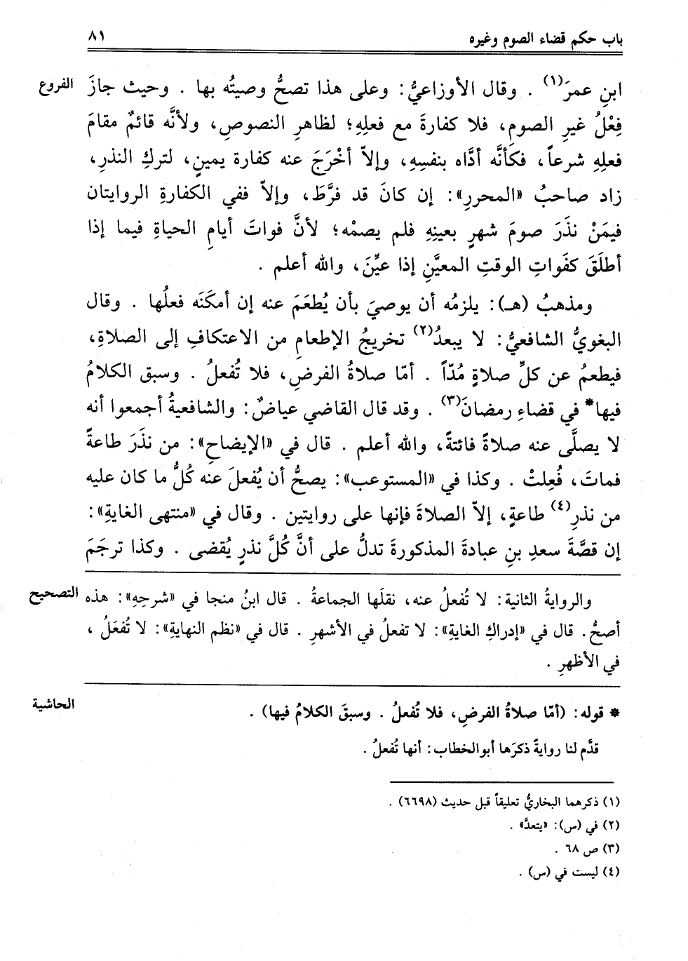 ابْنِ عُمَرَ1, وَقَالَهُ الْأَوْزَاعِيُّ, وَعَلَى هَذَا تَصِحُّ وَصِيَّتُهُ بِهَا. وَحَيْثُ جَازَ فِعْلُ غَيْرِ الصَّوْمِ فَلَا كَفَّارَةَ مَعَ فِعْلِهِ, لِظَاهِرِ النُّصُوصِ, وَلِأَنَّهُ قَائِمٌ مَقَامَ فِعْلِهِ شَرْعًا, فَكَأَنَّهُ أَدَّاهُ بِنَفْسِهِ, وَإِلَّا أَخْرَجَ عَنْهُ كَفَّارَةَ يَمِينٍ, لِتَرْكِ النَّذْرِ. زَادَ صَاحِبُ الْمُحَرَّرِ: إنْ كَانَ قَدْ فَرَّطَ, وَإِلَّا فَفِي الْكَفَّارَةِ الرِّوَايَتَانِ فِيمَنْ نَذَرَ صَوْمَ شَهْرٍ بِعَيْنِهِ فَلَمْ يَصُمْهُ, لِأَنَّ فَوَاتَ أَيَّامِ الْحَيَاةِ فِيمَا إذَا أُطْلِقَ كَفَوَاتِ الْوَقْتِ الْمُعَيَّنِ إذَا عُيِّنَ, وَاَللَّهُ أَعْلَمُ.