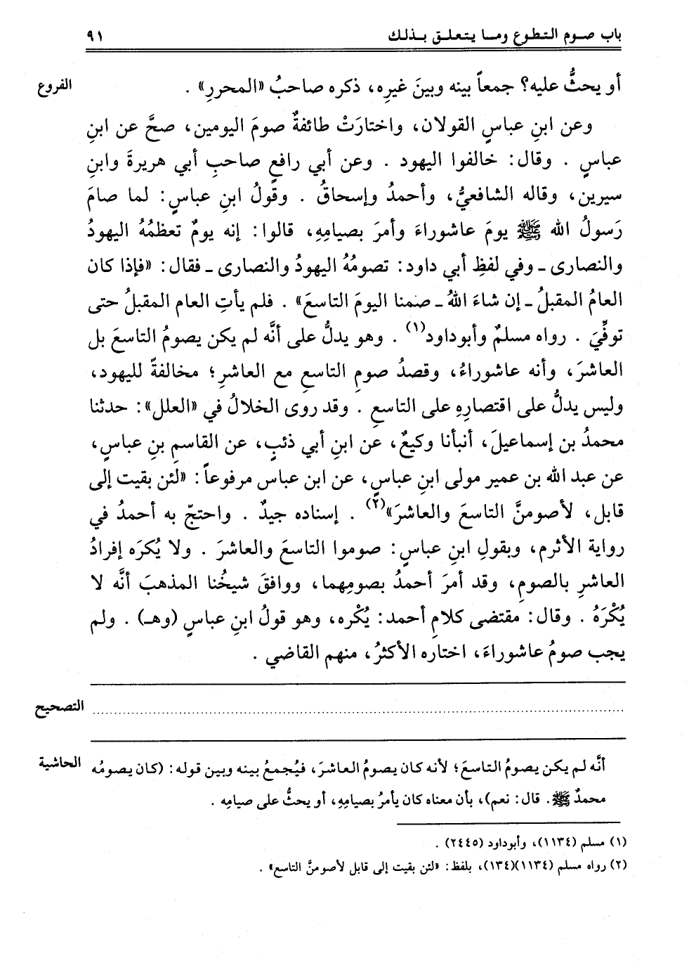 وَعَنْ ابْنِ عَبَّاسٍ الْقَوْلَانِ, وَاخْتَارَتْ طَائِفَةٌ صَوْمَ الْيَوْمَيْنِ, صَحَّ عَنْ ابْنِ عَبَّاسٍ وَقَالَ: خَالِفُوا الْيَهُودَ وَعَنْ أَبِي رَافِعٍ صَاحِبِ أَبِي هُرَيْرَةَ وَابْنِ سِيرِينَ, وَقَالَهُ الشَّافِعِيُّ وَأَحْمَدُ وَإِسْحَاقُ. وَقَوْلُ ابْنِ عَبَّاسٍ: لَمَّا صَامَ رَسُولُ اللَّهِ صَلَّى اللَّهُ عَلَيْهِ وَسَلَّمَ يَوْمَ عَاشُورَاءَ وَأَمَرَ بِصِيَامِهِ قَالُوا: إنَّهُ يَوْمٌ تُعَظِّمُهُ الْيَهُودُ وَالنَّصَارَى وَفِي لَفْظِ أَبِي دَاوُد: تَصُومُهُ الْيَهُودُ وَالنَّصَارَى فَقَالَ "فَإِذَا كَانَ الْعَامُ الْمُقْبِلُ إنْ شَاءَ اللَّهُ صُمْنَا الْيَوْمَ التَّاسِعَ" فَلَمْ يَأْتِ الْعَامُ الْمُقْبِلُ حَتَّى تُوُفِّيَ. رَوَاهُ مُسْلِمٌ وَأَبُو دَاوُد1, وَهُوَ يَدُلُّ عَلَى أَنَّهُ لَمْ يَكُنْ يَصُومُ التَّاسِعَ بَلْ الْعَاشِرَ وَأَنَّهُ عَاشُورَاءُ, وَقَصَدَ صَوْمَ التَّاسِعِ مَعَ الْعَاشِرِ مُخَالَفَةً لِلْيَهُودِ لَيْسَ يَدُلُّ عَلَى اقْتِصَارِهِ عَلَى التَّاسِعِ, وَقَدْ رَوَى الْخَلَّالُ فِي الْعِلَلِ: حَدَّثَنَا مُحَمَّدُ بْنُ إسْمَاعِيلَ أَنْبَأَنَا وَكِيعٌ عَنْ ابْنُ أَبِي ذِئْبٍ عَنْ الْقَاسِمِ بْنِ عَبَّاسٍ عَنْ عَبْدِ اللَّهِ بْنِ عُمَيْرٍ مَوْلَى ابْنِ عَبَّاسٍ, عَنْ ابْنِ عَبَّاسٍ مَرْفُوعًا "لَئِنْ بَقِيت إلَى قَابِلٍ لَأَصُومَنَّ التَّاسِعَ وَالْعَاشِرَ" 2 إسْنَادُهُ جَيِّدٌ. وَاحْتَجَّ بِهِ أَحْمَدُ فِي رِوَايَةِ الْأَثْرَمِ. وَبِقَوْلِ ابْنِ عَبَّاسٍ: صُومُوا التَّاسِعَ وَالْعَاشِرَ. وَلَا يُكْرَهُ إفْرَادُ الْعَاشِرِ بِالصَّوْمِ. وَقَدْ أَمَرَ أَحْمَدُ بِصَوْمِهِمَا, وَوَافَقَ شَيْخُنَا الْمَذْهَبَ أَنَّهُ لَا يُكْرَهُ, وَقَالَ: مُقْتَضَى كَلَامِ أَحْمَدَ يُكْرَهُ, وَهُوَ قَوْلُ ابْنِ عَبَّاسٍ "وهـ" وَلَمْ يَجِبْ صَوْمُ عَاشُورَاءَ, اخْتَارَهُ الْأَكْثَرُ, مِنْهُمْ الْقَاضِي,