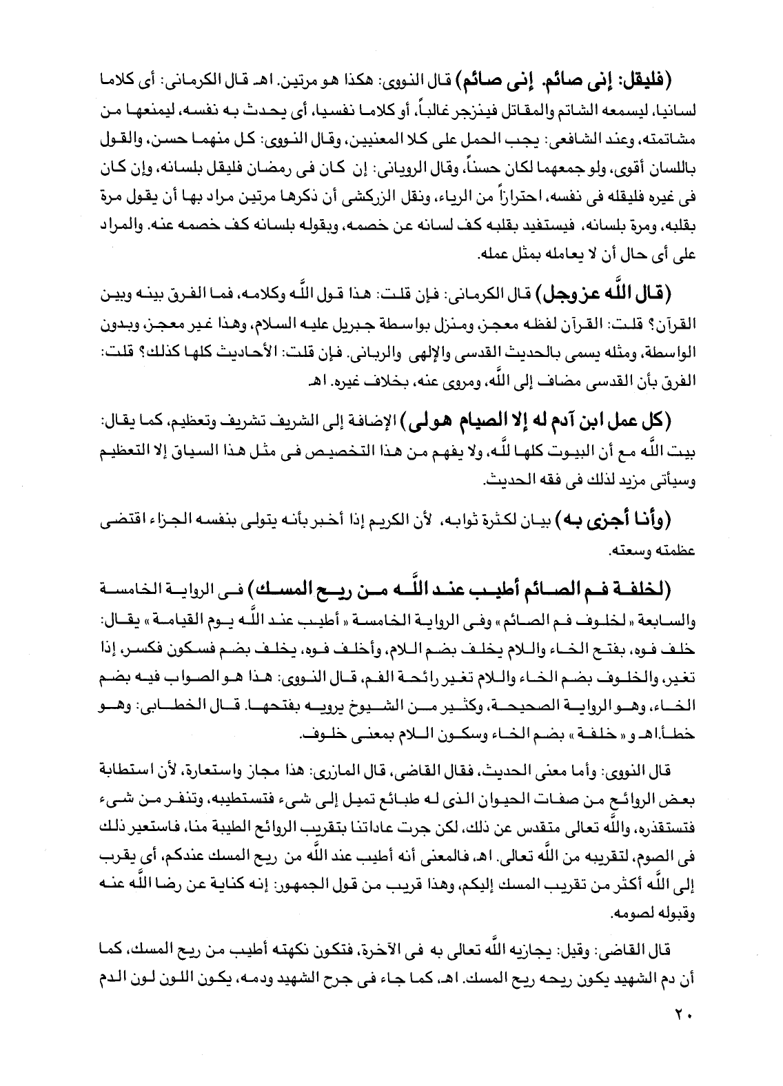 (فليقل: إني صائم. إني صائم) قال النووي: هكذا هو مرتين. اهـ قال الكرماني: أي كلاماً لسانياً، ليسمعه الشاتم والمقاتل فينزجر غالباً، أو كلاماً نفسياً، أي يحدث به نفسه، ليمنعها من مشاتمته، وعند الشافعي: يجب الحمل على كلا المعنيين، وقال النووي: كل منهما حسن، والقول باللسان أقوى، ولو جمعهما لكان حسناً، وقال الروياني: إن كان في رمضان فليقل بلسانه، وإن كان في غيره فليقله في نفسه، احترازاً من الرياء، ونقل الزركشي أن ذكرها مرتين مراد بها أن يقول مرة بقلبه، ومرة بلسانه، فيستفيد بقلبه كف لسانه عن خصمه، وبقوله بلسانه كف خصمه عنه. والمراد على أي حال أن لا يعامله بمثل عمله.